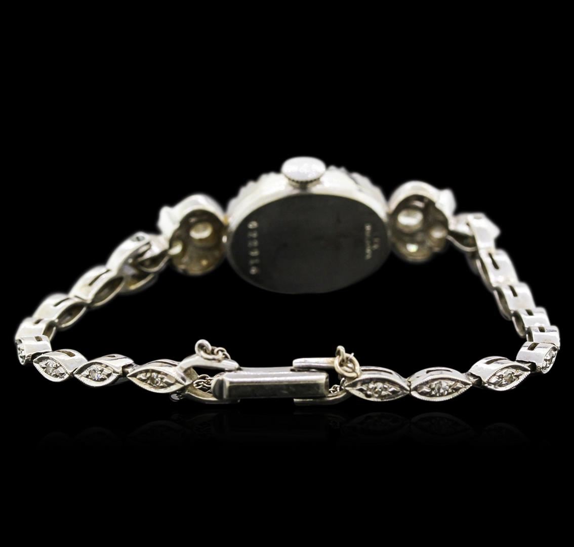 One ladies, vintage Bulova wristwatch electronically tested 14KT White gold, Case: 19 x 14mm, Case Back: space available for engraving, Rigid Case Lug terminals: set with diamonds, Fixed Case Lugs: set with diamonds, Crown: engraved with the manufacturers name, scalloped edge, Bezel: diamond set, Crystal: acrylic. Bulova USA Movement: 23 jewel mechanical stem wind, Bulova Signed Dial: pointed hands, indices and two numerals, 14KT White gold Bracelet: set throughout with diamonds, Condition: G- 4 Average. Five and one half inch length, adjustable. Containing: Forty Four, prong set single & round brilliant cut diamonds, approximate total weight of 44 Stones = 0.92ct. Graded in the setting. Clarity: SI-1 to SI-2 Average. Color: H - J. Total Weight of Diamonds 0.92ct. Total Weight of Watch 14.91 grams. AIG Appraised at $4,050.00.