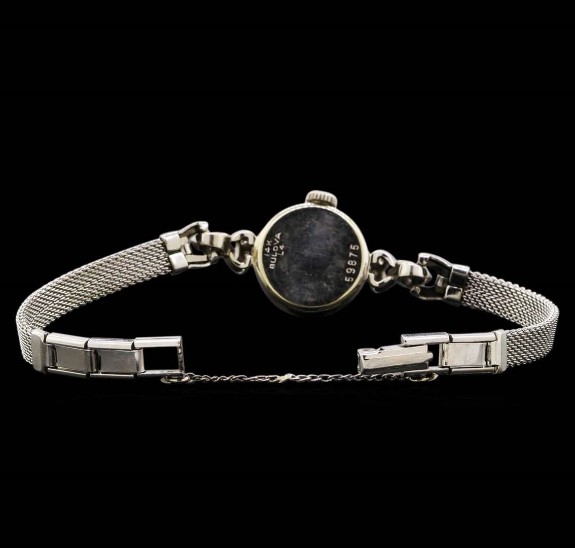 One ladies, vintage Bulova diamond wristwatch electronically tested, 14KT white gold Case: 15mm diameter, Scalloped Crown: dial & movement set, Bezel: diamond, Crystal: domed acrylic. Case No. 59875.Swiss Movement: seventeen jewel unadjusted mechanical, Dial: cream color, with baton pointed type hands, & indices, 10KT white gold Bracelet: mesh link, Condition: G-4 Average. Bright polish finish, Five inch length. Over locking clasp. Containing: Twenty Six bright cut & bead set single cut diamonds, approximate. Total Weight of 26 Stones = 0.22ct. Graded in the setting. Clarity: SI-1 to I-1. Color: G - I. Total Weight of Diamonds 0.22ct. Total Weight of Watch 9.80 grams. AIG Appraised at $3,550.00.