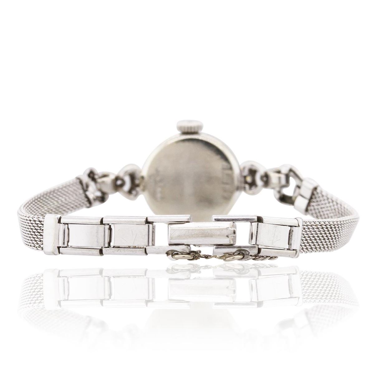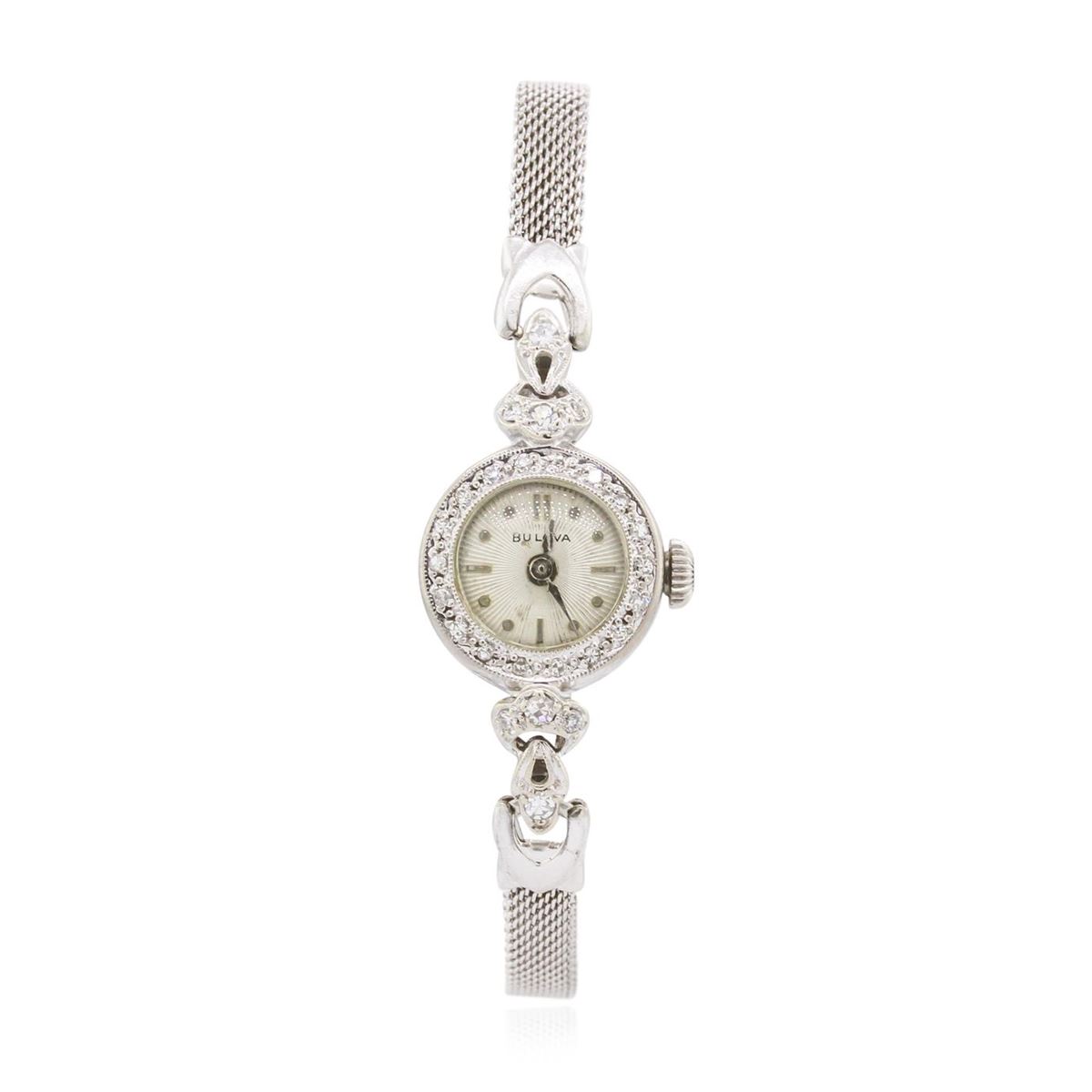 One ladies, vintage Bulova diamond wristwatch electronically tested, 14KT white gold Case: 15mm diameter, Scalloped Crown: dial & movement set, Bezel: diamond, Crystal: domed acrylic. Case No. 59875.Swiss Movement: seventeen jewel unadjusted mechanical, Dial: cream color, with baton pointed type hands, & indices, 10KT white gold Bracelet: mesh link, Condition: G-4 Average. Bright polish finish, Five inch length. Over locking clasp. Containing: Twenty Six bright cut & bead set single cut diamonds, approximate. Total Weight of 26 Stones = 0.22ct. Graded in the setting. Clarity: SI-1 to I-1. Color: G - I. Total Weight of Diamonds 0.22ct. Total Weight of Watch 9.80 grams. AIG Appraised at $3,550.00.