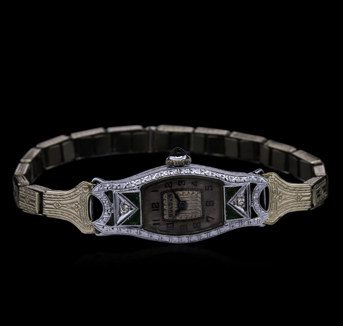 16.2 grams total weight; 4 green emeralds, 2 round single cut diamonds; band (stretch) goes from 6 3/4" to 8" at maximum stretch; Case measurements: 14 mm x 26 mm; Only the case is 14k White Gold (stamped Bulova 14k). Bracelet is plated.; Movement is stamped 15544 5AP Movement 15 Jewels; Outer sides of case stamped PAT 3.11.73.