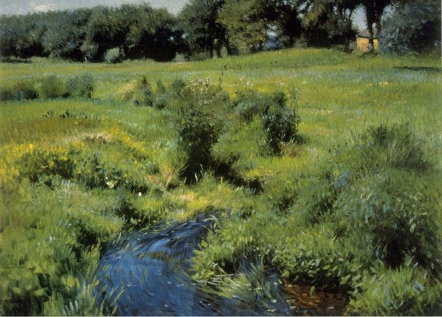Artist: Dennis Miller Bunker - Title: The Pool - Medium: Fine Art Reproduction Giclee on Canvas - Image Size: Approximately 14.25 inches x 20 inches - Unframed on Unstretched Canvas - Biography: Dennis Miller Bunker was born in New York City, Dennis Miller Bunker became a portrait artist and Impressionist landscape painter whose work reflects the rapidly changing tastes of his time from Barbizon inspired tonalist landscapes to full-blown Impressionism. - He earned a prestigious reputation on the East Coast during his short life of twenty-nine years. During the decade of his career, he painted 225 pictures, and in 1978, the New Britain Museum of American Art organized the first major Bunker retrospective since one in 1891 shortly after his death at Boston's St. Bodolph Club.