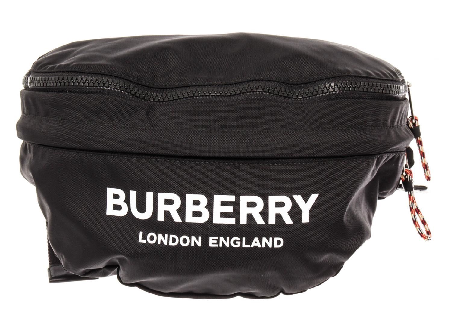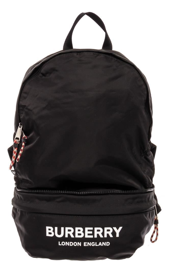 Panelled convertible nylon satin and canvas backpack in black. Tonal leather detailing throughout. Webbing carry handle at top. Twin adjustable shoulder straps with cinch fastening and adjustable webbing belt-style strap featuring press-release fastening at back. Zippered pocket and logo printed in white at face. Embossed tonal leather logo patch at interior. Two-way zip closure at main compartment. Silver-tone hardware. (L) 5,11" x (H) 7,87" x (W) 1,96" / 13 x 20 x 5cm