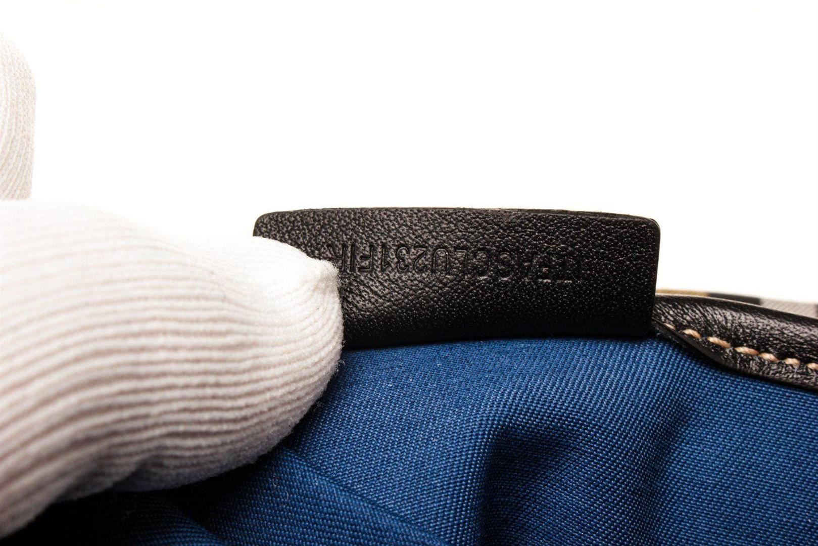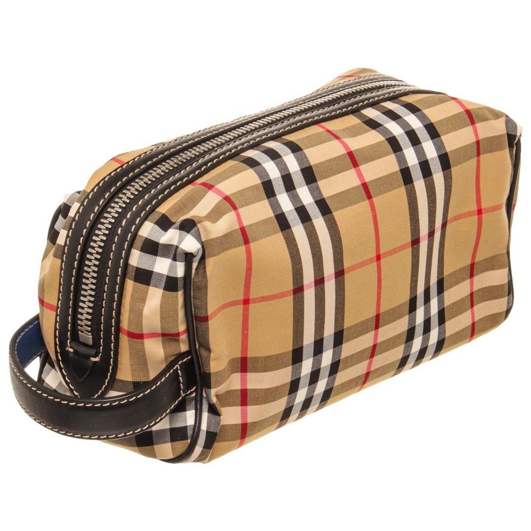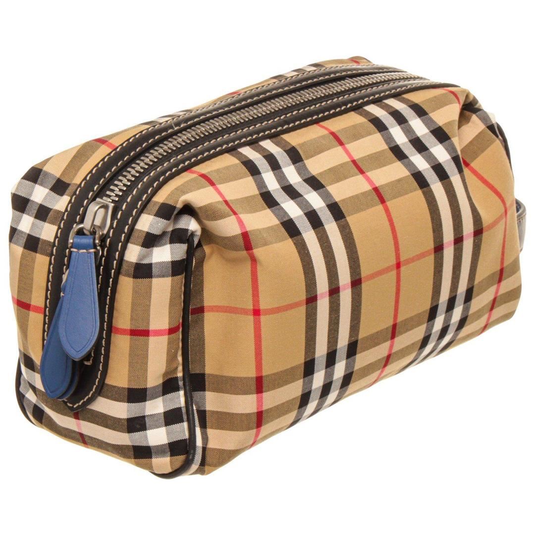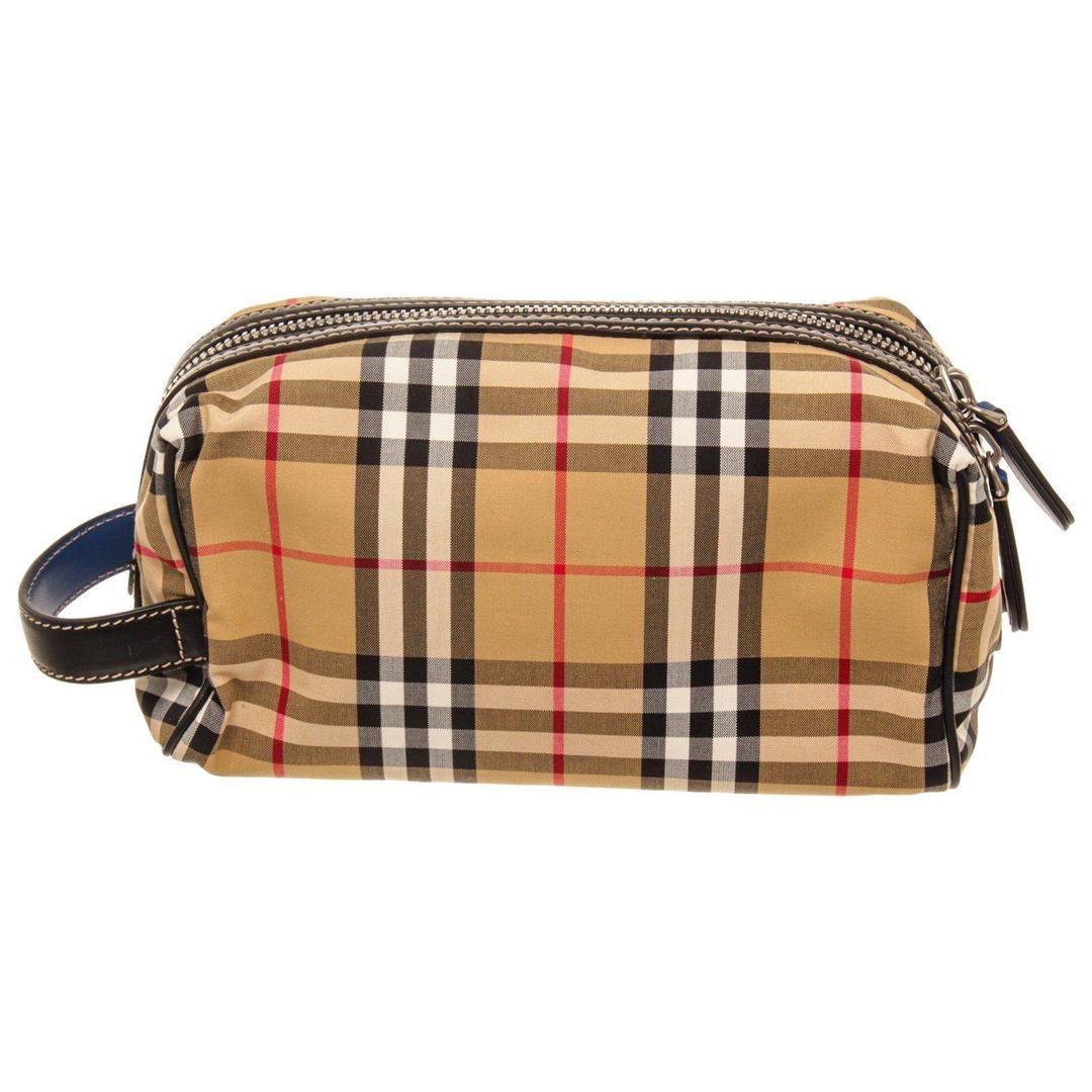 Burberry Tan Patent Leather Cosmetic Pouch with patent leather trim, silver-tone hardware, interior zip pocket, front exterior flap pocket with snap closure, zip top closure, adjustable patent leather shoulder strap.