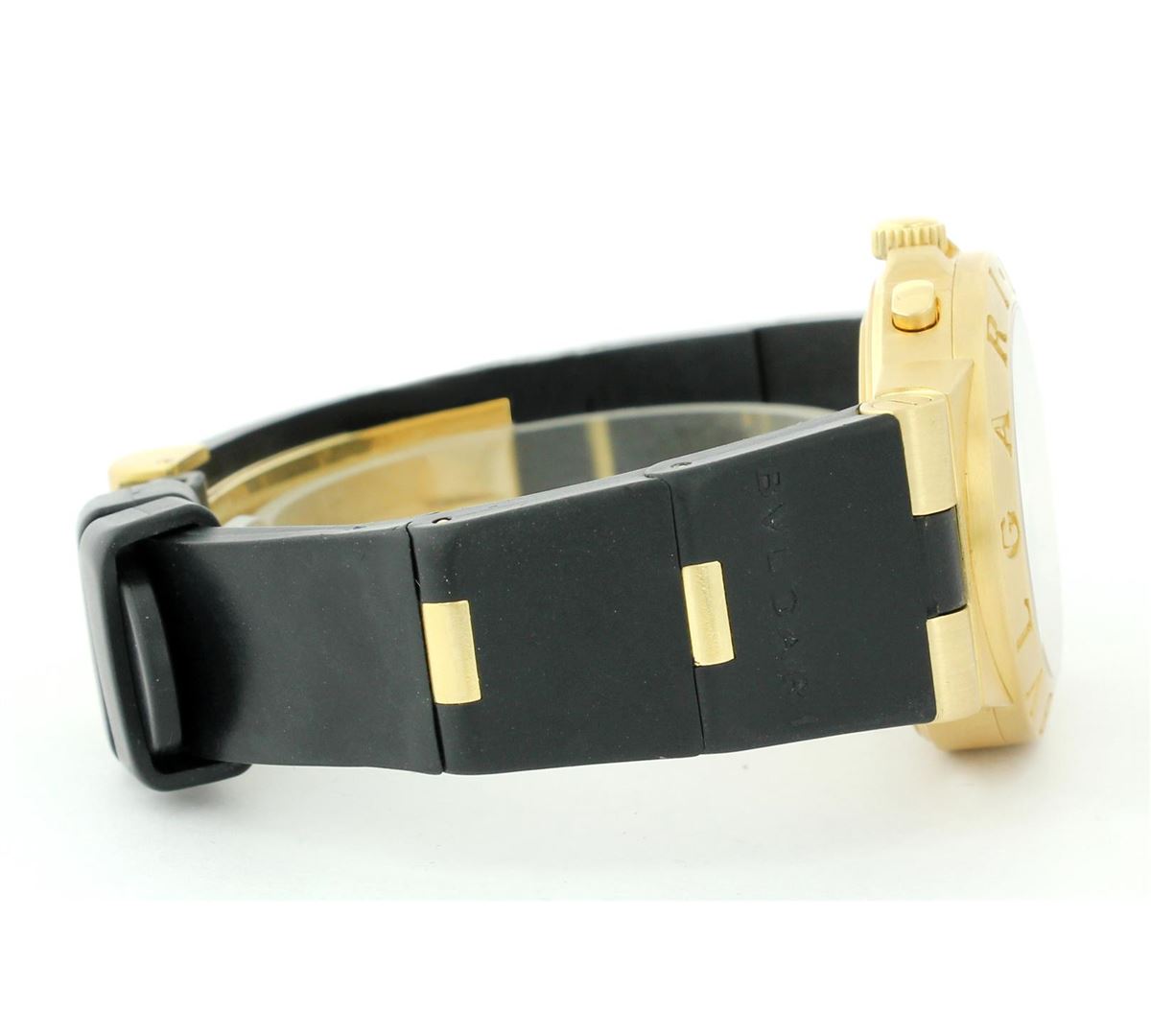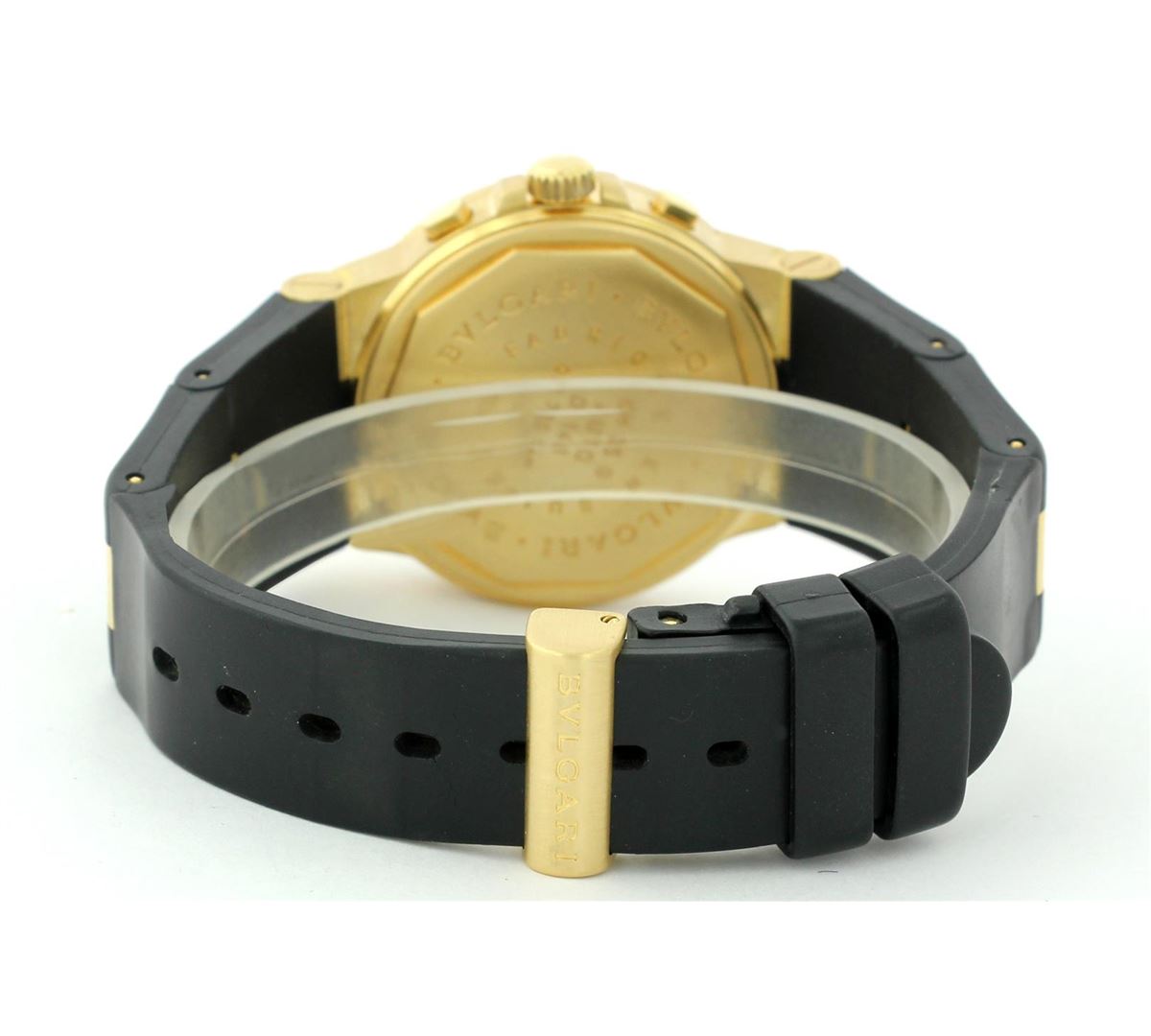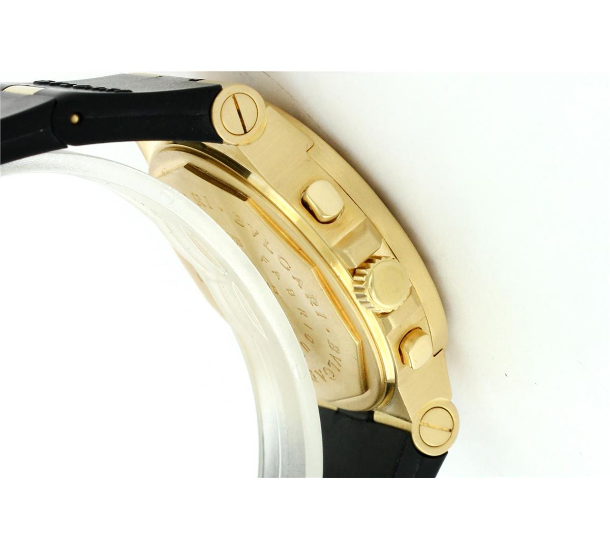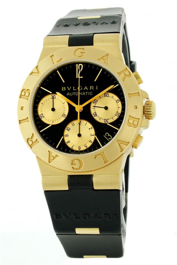 One Gents Yellow Gold Bvlgari Chronograph CH35, Serviced & Electronically Tested, Case:35mm 18K Yellow Gold, Yellow Gold Crown, Bezel: 18K Yellow Gold Bezel, Crystal: Sapphire Lens. Movement: Quartz Movement. Dial: Black Dial With Index Hour Markers And Three Chronograph Sub Dials, Date: At 3 O'Clock Position. Model#CH35 Condition: G-6 Extra Fine. Band: Black Rubber Band with Gold Bvlgari Clasp, 6.5 Inch Length, Adjustable. Standard Bvlgari Gold Clasp.