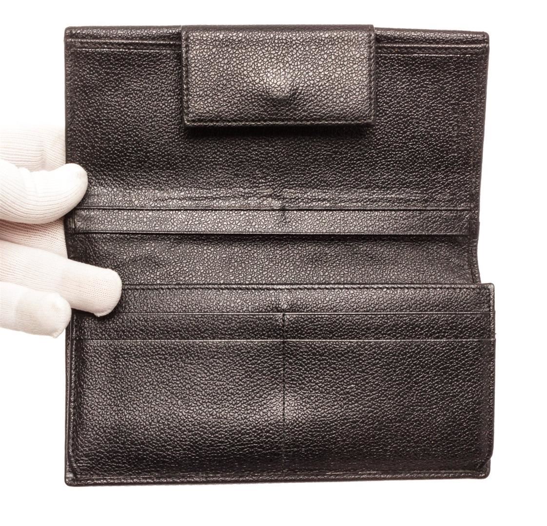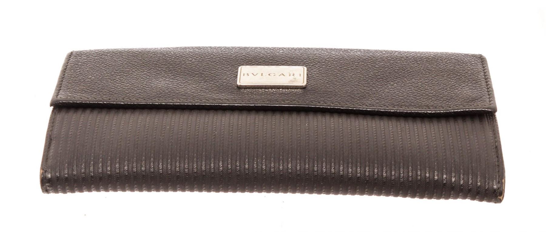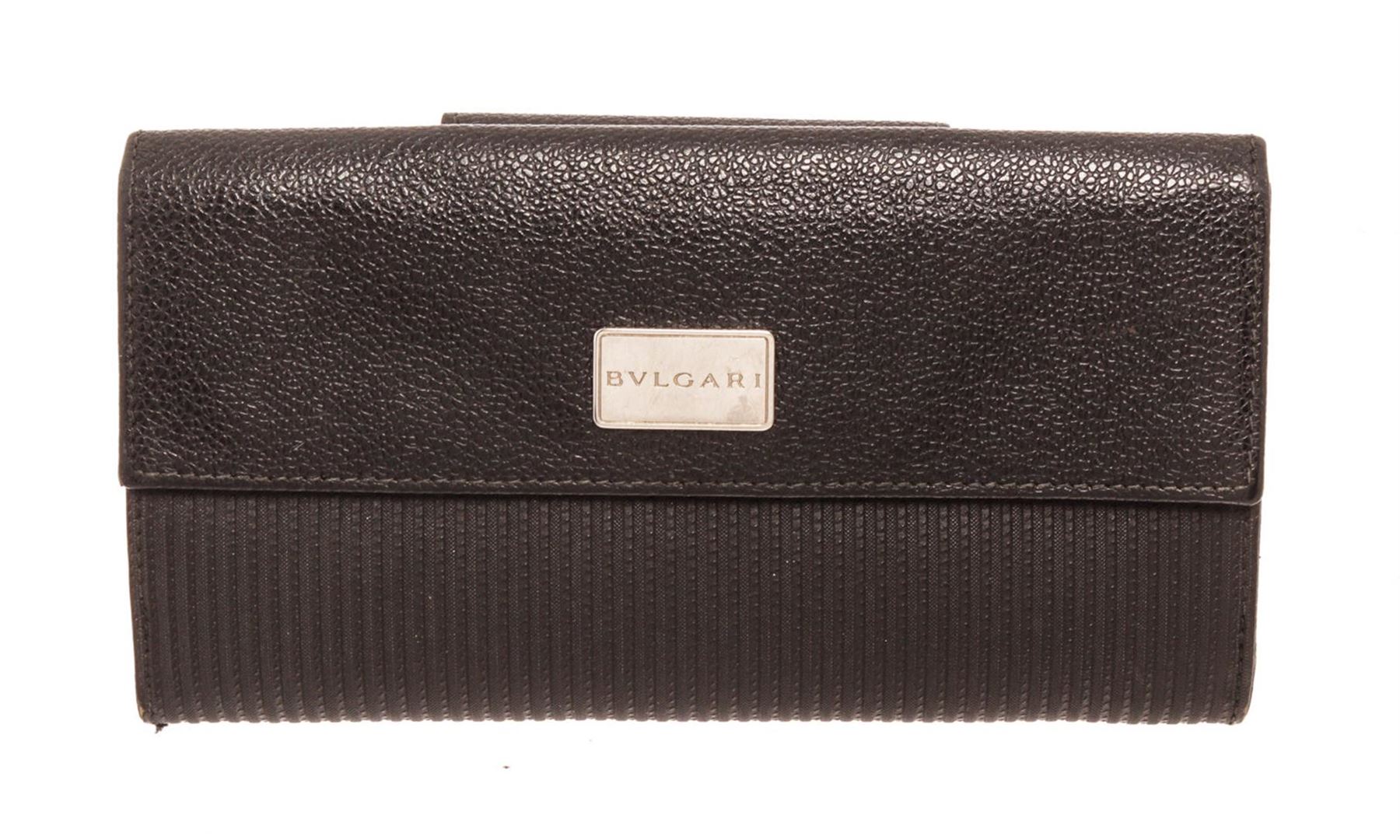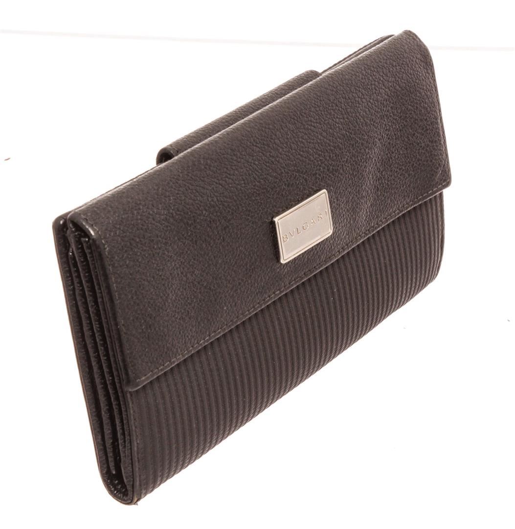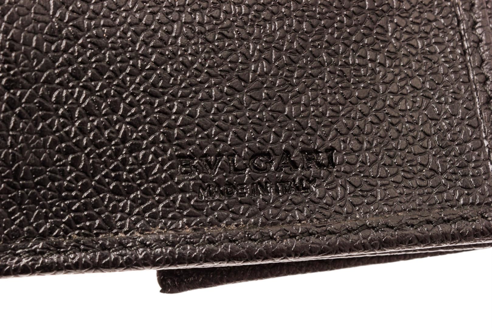 Bvlgari Black Leather Flap Wallet. Please see photos and description for all available information! Bvlgari Black Leather Flap Wallet with gold-tone hardware, trim leather, interior card holder pocket, leather lining and snap closure.