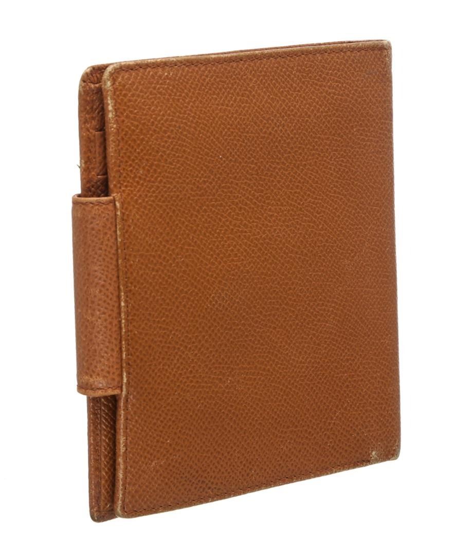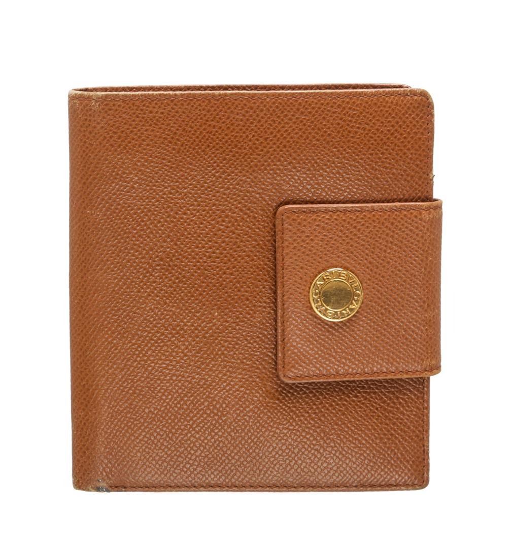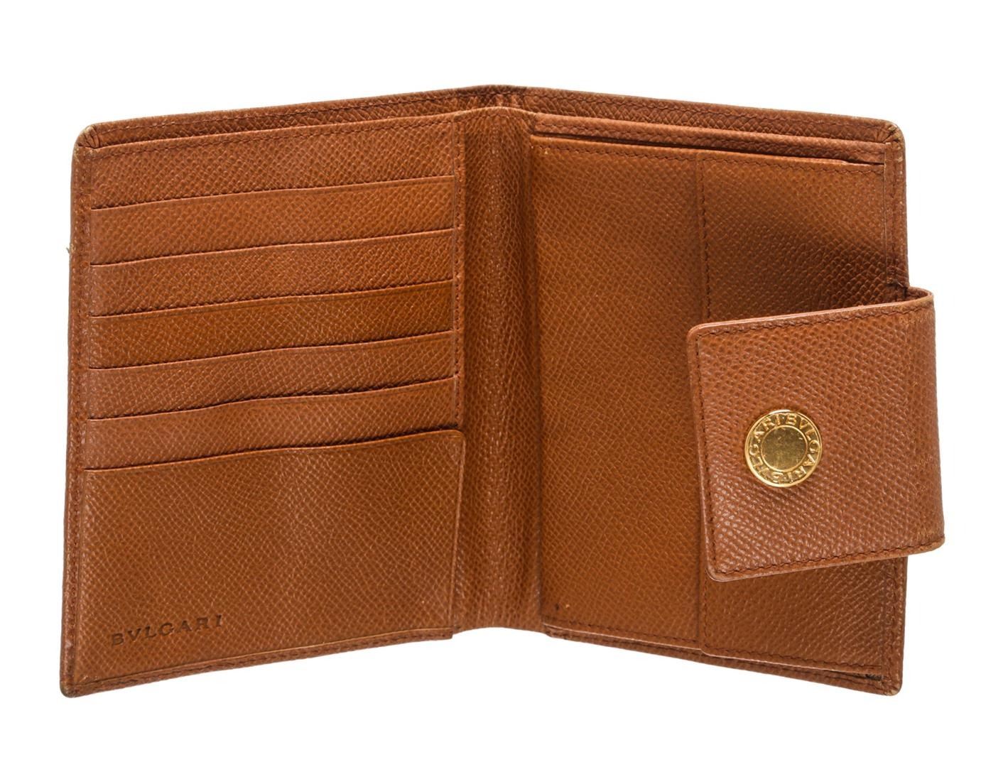 Brown leather Bvlgari compact wallet with gold-tone hardware, woven logo printed lining, dual bill compartment, five card slots, side slip pocket, coin pocket with snap closure and overall snap closure.