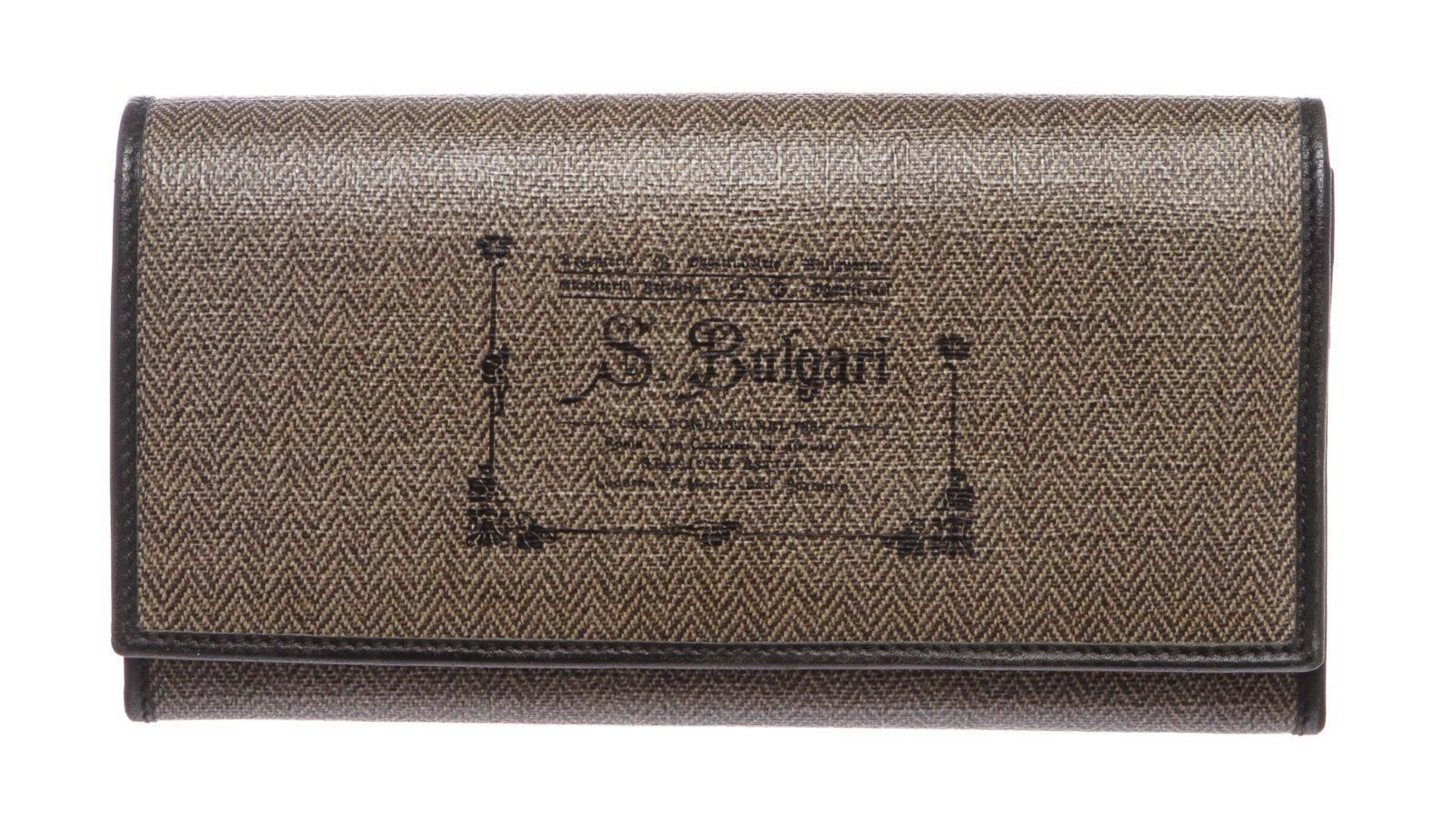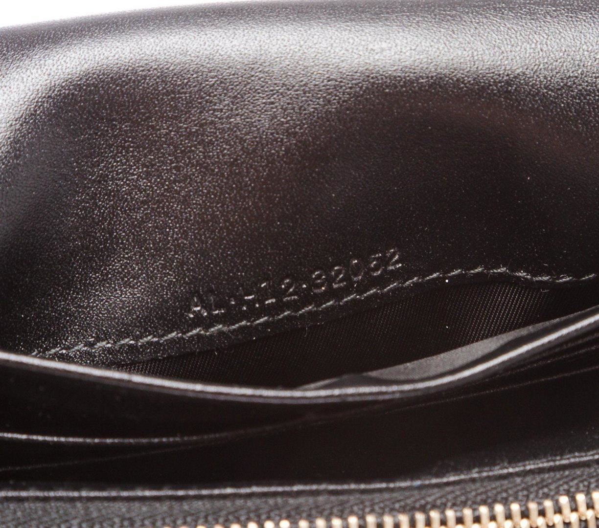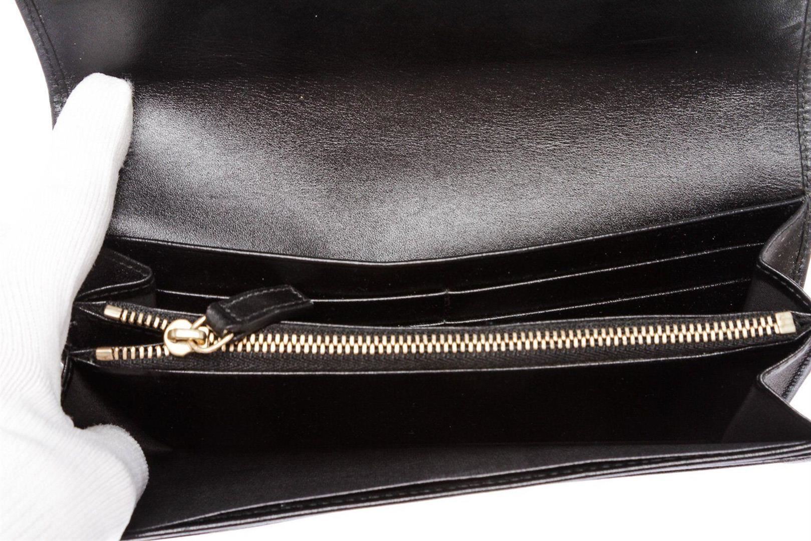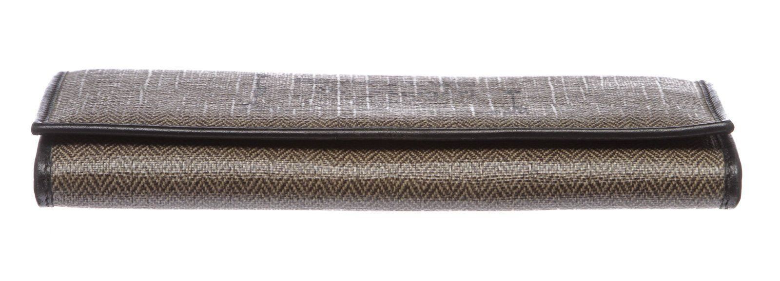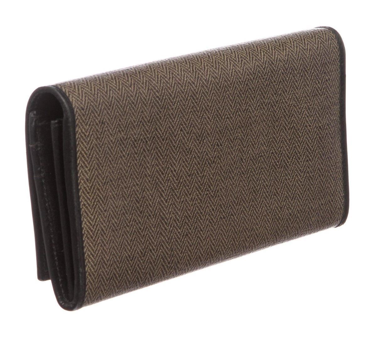 Overall flap snap closure. Interior is leather lined with ten credit card slip pockets, two compartments with zipper pocket partition and one billfold slip pocket. Measurements: Length: 7.5 in / 19 cm Width: 1 in / 3 cm 4 in / 10 cmCONDITION: Pre-Owned Good overall, please see photographs for detail.