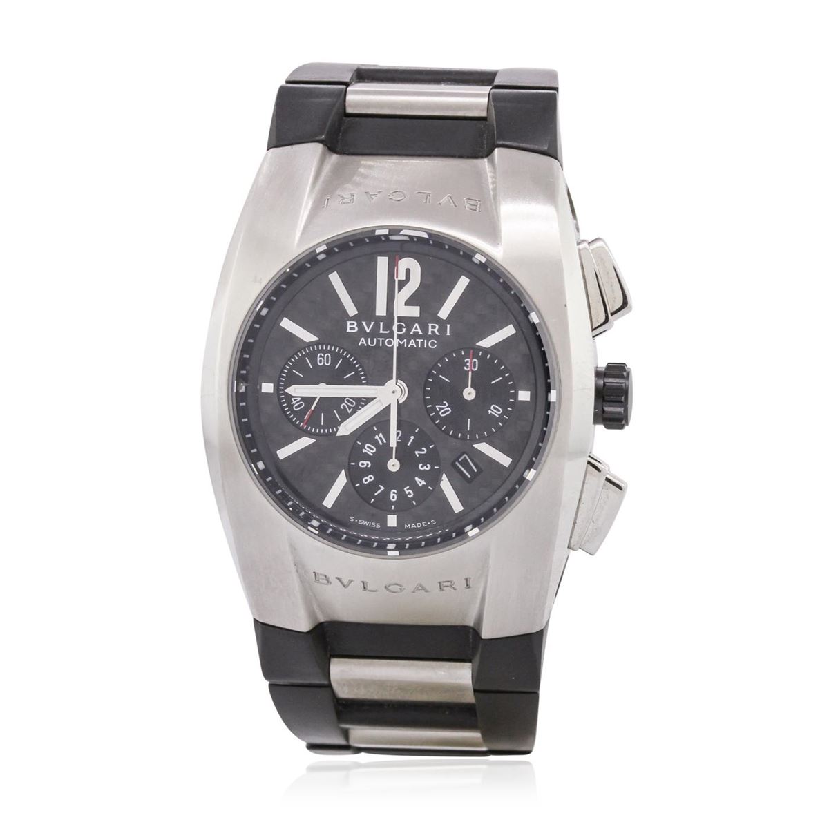 One Bvlgari Ergon wristwatch featuring: Stainless Steel case, crown, lugs, and bezel, black bracelet with deployment clasp, black dial with analog display, three subdials, Arabic 12, date at 4 o'clock position. This item measures 40mm across, including crown, and weighs a total of 115.10 grams.