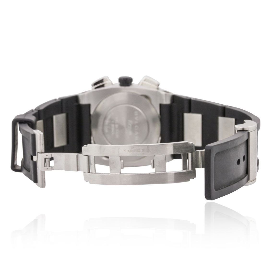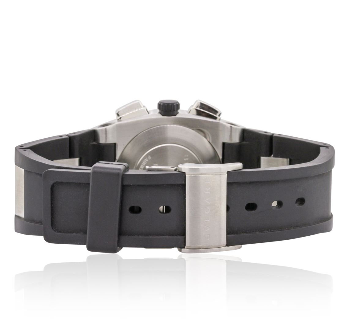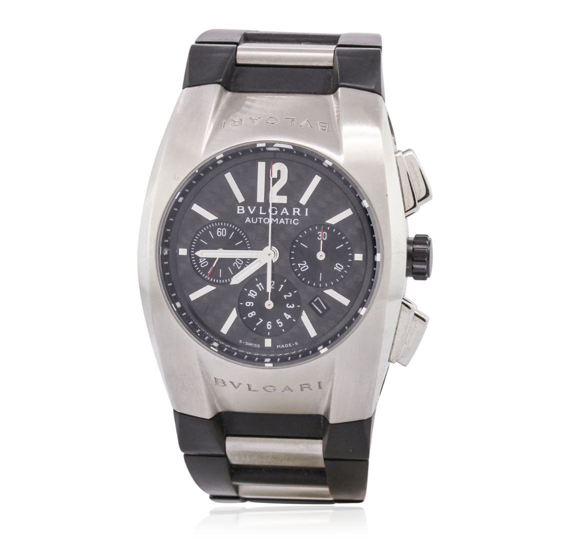 One Bvlgari Ergon wristwatch featuring: Stainless Steel case, crown, lugs, and bezel, black bracelet with deployment clasp, black dial with analog display, three subdials, Arabic 12, date at 4 o'clock position. This item measures 40mm across, including crown, and weighs a total of 115.10 grams.