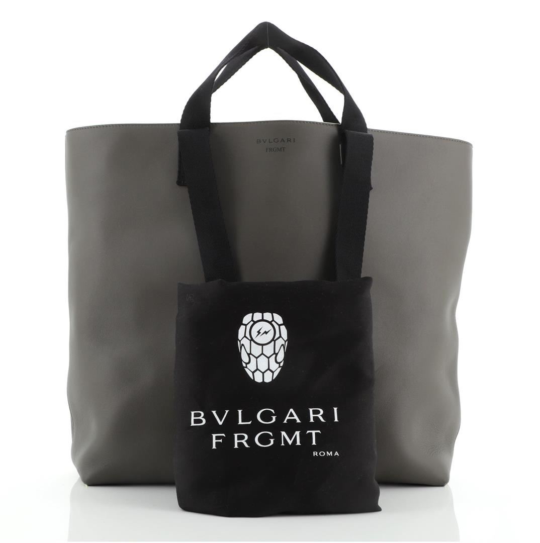 One Bvlgari Fragment Convertible Tote Leather Neutral. Item is sold AS-IS. All available information is listed in the description and shown in the photo. Bvlgari Fragment Convertible Tote Leather Neutral Condition Details: Creasing, scuffs and indentations on exterior, wear on rear base corners. Stains and pen marks in interior, scratches on hardware. Height 14", Width 14", Depth 4.5", Strap Drop 12