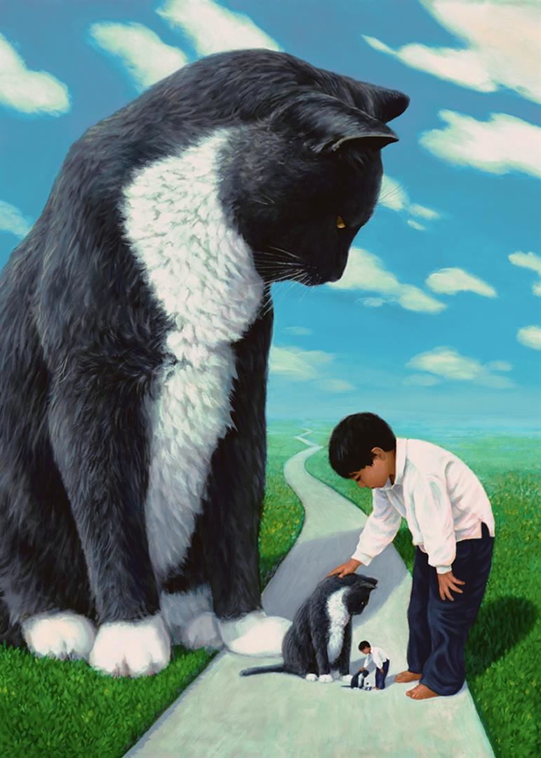 Giclee on canvas, limited edition, embellished by Charles Lynn Bragg. Cody (boy) and Max (cat) take care of each other and their cosmic bond. 11 x 14.5