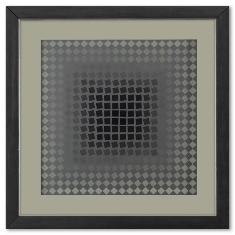 CTA - 106 - ARG de la serie CTA - 102 by Vasarely (1908-1997). "CTA - 106 - ARG de la série CTA - 102" is a heliogravure print on paper, published in 1971, by Victor Vasarely (1908-1997). This piece comes custom framed, with a letter of authenticity and with a 1976 Vasarely paperback. Measures approx. 11.5" x 11.5" (frame), 9" x 9" (image).