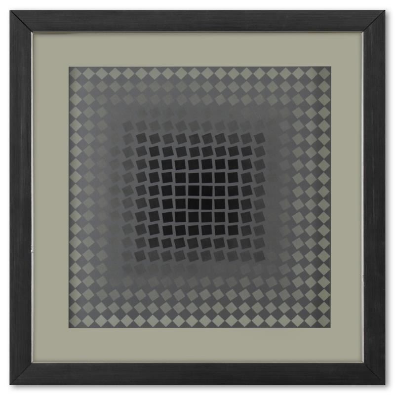"CTA - 106 - ARG de la série CTA - 102" is a heliogravure print on paper, published in 1971, by Victor Vasarely (1908-1997). This piece comes custom framed, with a letter of authenticity and with a 1976 Vasarely paperback. Measures approx. 11.5" x 11.5" (frame), 9" x 9" (image).