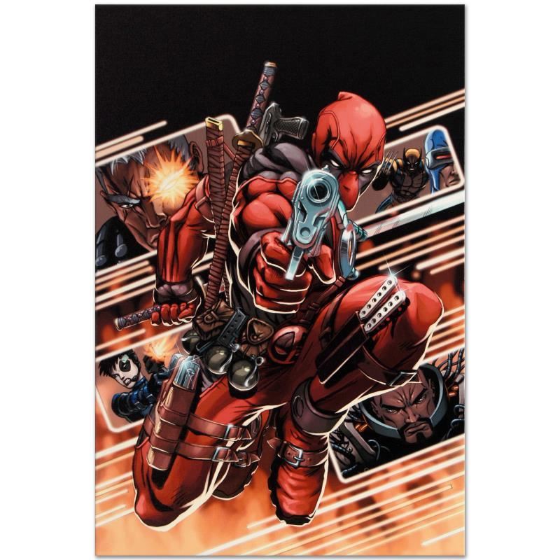 A piece of comic book history, this limited edition, from original art by Patrick Zircher, depicts Deadpool and Cable among other X-Men characters. Zircher's early career as an illustrator in the genre began with production of several completed works for Villains and Vigilantes, Champions and other pen and paper role-playing games as well as early stints with independent comic book publishers. Following this, he went on to work largely for Marvel Comics on leading titles like Iron Man, Thunderbolts and New Warriors, but also did a considerable amount of work for DC. He is currently exclusive with Marvel Comics. "Cable & Deadpool #9" is a limited edition giclee on canvas by Patrick Zircher presented by Marvel Comics! This piece comes gallery wrapped. Includes Certificate of Authenticity! Measures approx. 18" x 27" (image). This item requires special handling and may have a longer than usual turnaround.