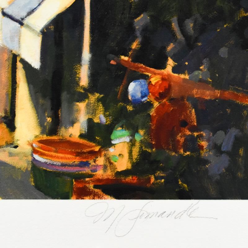 "Cafe Bella" is a limited edition giclee on paper by Marilyn Simandle, numbered and hand signed by the artist. Includes Letter of Authenticity. Measures approx. 30" x 38.5" (border), 25" x 33" (image).