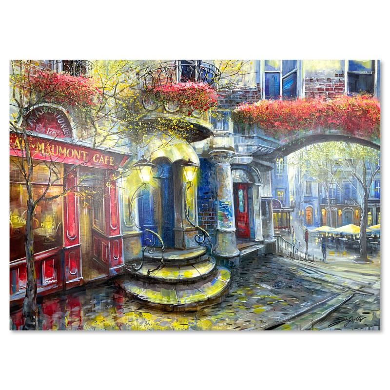 "Cafe Maumont" is an original oil painting on stretched canvas by Vadik Suljakov, hand signed by the artist. Includes Letter of Authenticity. Measures approx. 40" x 30" (image).