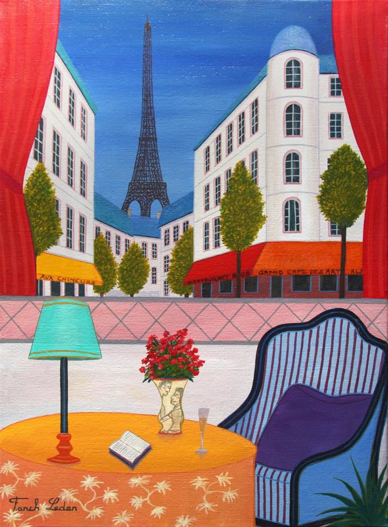 A charming Paris Cafe 13x18.25", Fanch Ledan's stretched acrylic on canvas with COA by artist,