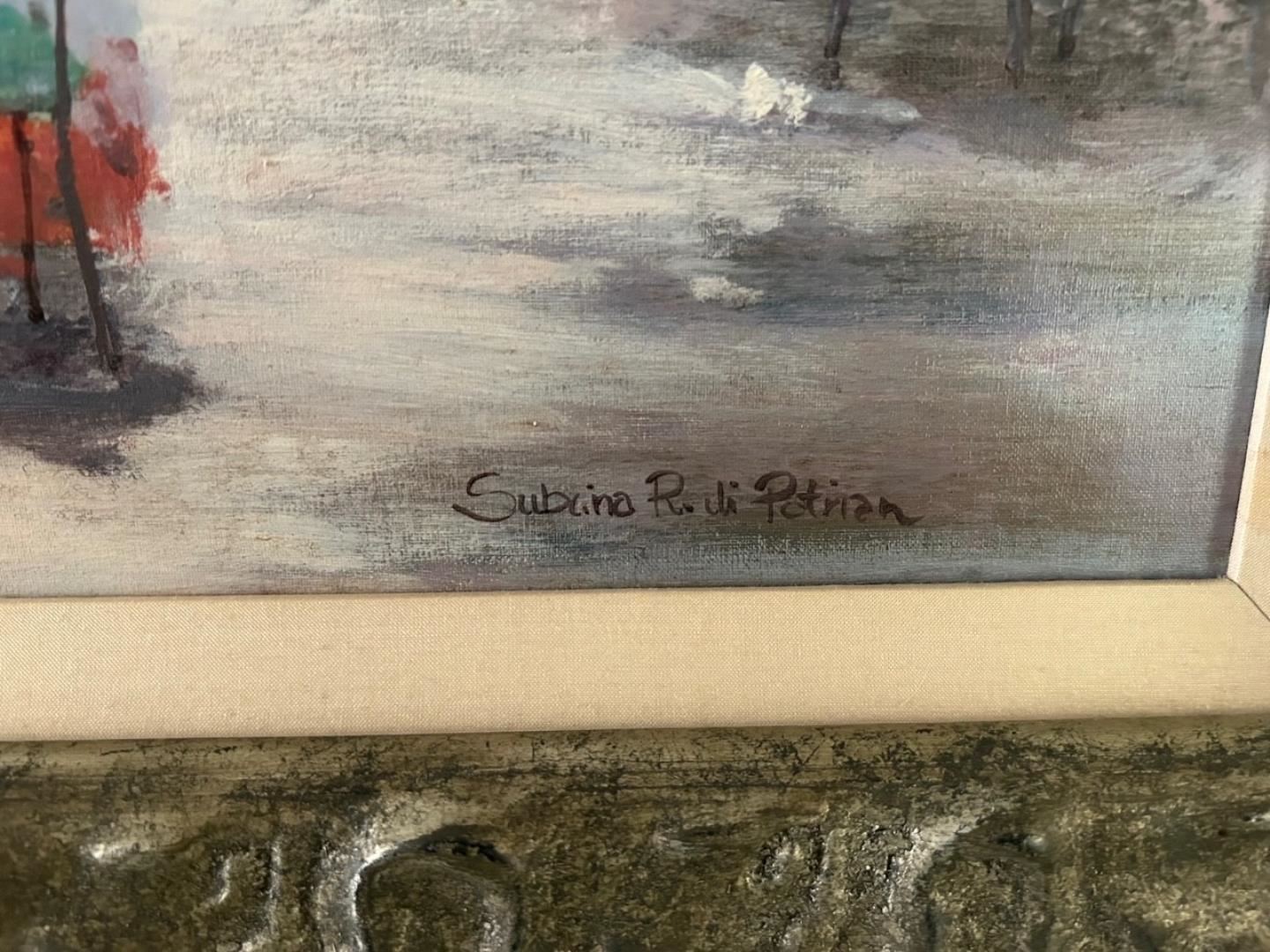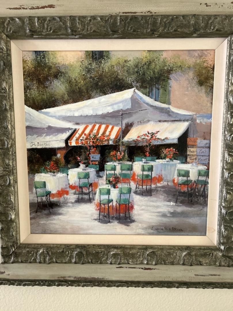 Exquisitely framed original oil on canvas by Subino diPatrian measures 25x25" with an image of 15.5x15.5". Depicts a café about to open for business.