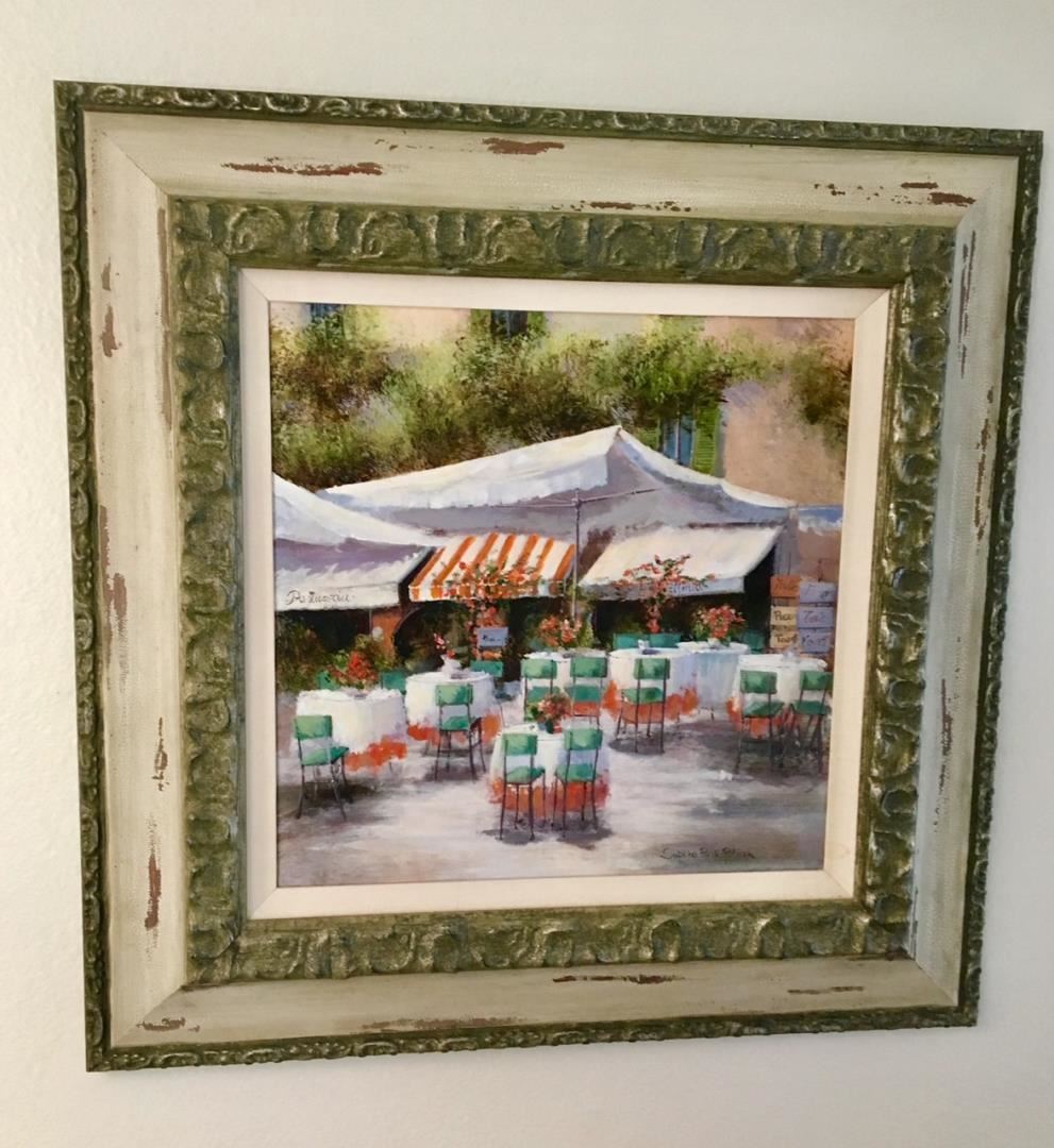 Exquisitely framed original oil on canvas by Subino diPatrian measures 25x25" with an image of 15.5x15.5". Depicts a café about to open for business.