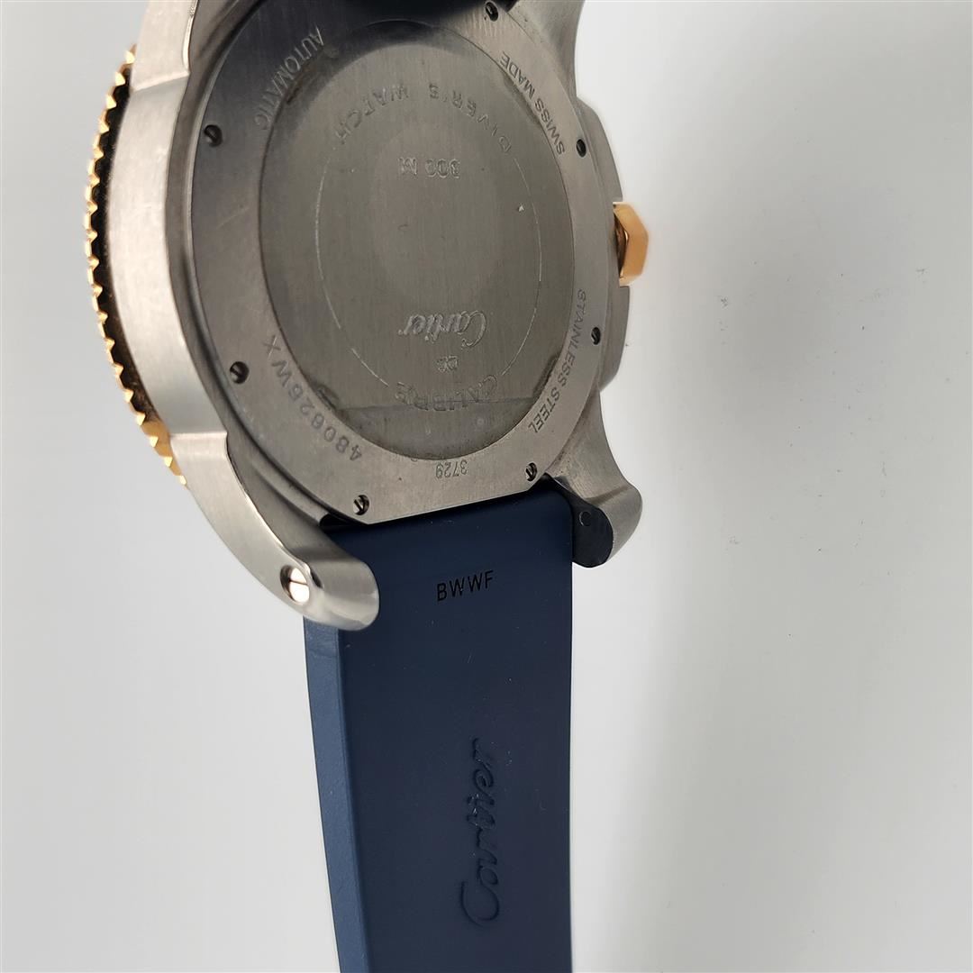 One Calibre de Cartier Swiss Made Automatic Wristwatch. - Swiss Made - Blue Dial - Roman Numeral Hour Markers - Blue Ceramic Bezel with Super-LumiNova Markers - Faceted Steel Crown Set with a Synthetic Spinel - Sword Shaped Blued Hands - Date Feature - Small Seconds Sub-Dial at 9 O'Clock - 48 Hour Power Reserve - Self-winding Automatic Movement - Cartier Caliber 1904-PS MC - Vibrations Per Hour: 28,800