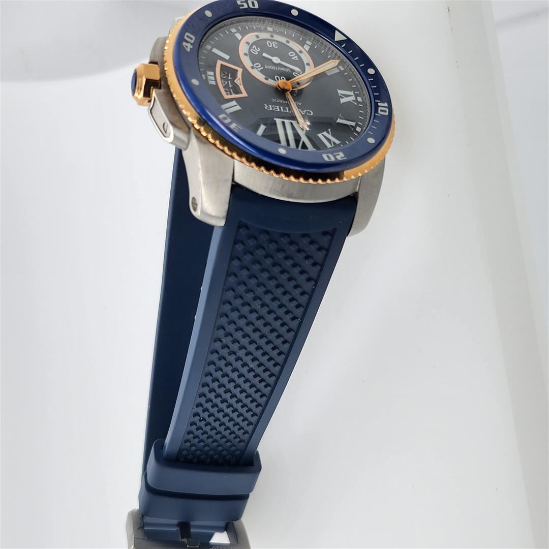 One Calibre de Cartier Swiss Made Automatic Wristwatch. - Swiss Made - Blue Dial - Roman Numeral Hour Markers - Blue Ceramic Bezel with Super-LumiNova Markers - Faceted Steel Crown Set with a Synthetic Spinel - Sword Shaped Blued Hands - Date Feature - Small Seconds Sub-Dial at 9 O'Clock - 48 Hour Power Reserve - Self-winding Automatic Movement - Cartier Caliber 1904-PS MC - Vibrations Per Hour: 28,800