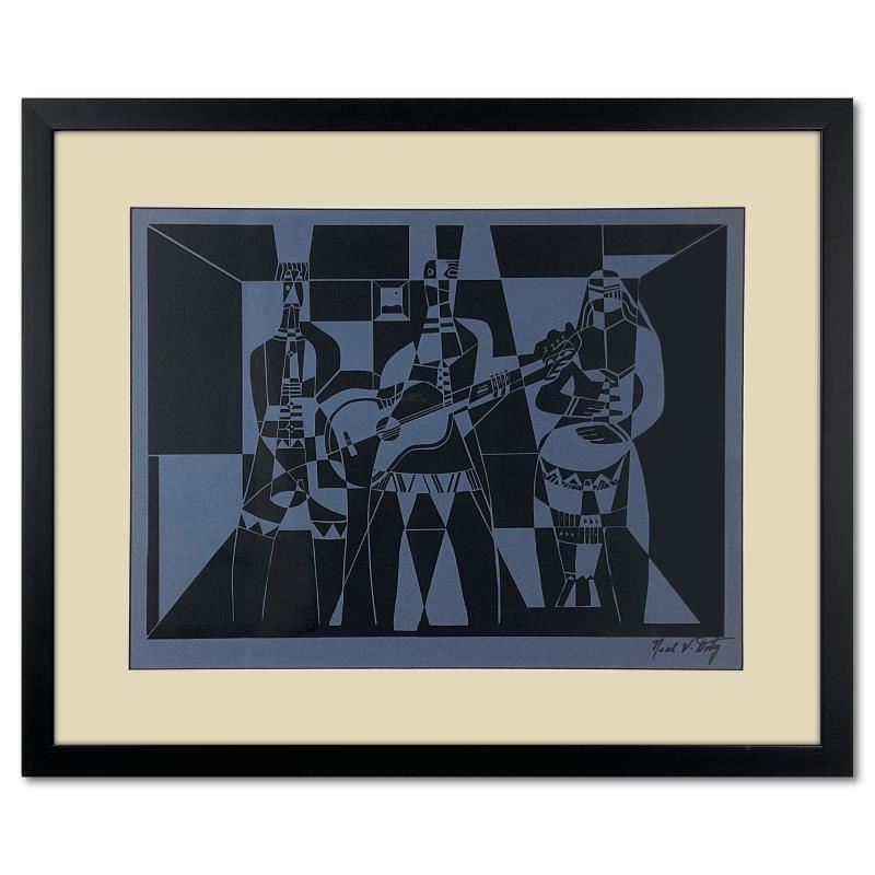 "California Jam" is a one-of-a-kind linocut on paper by Neal Doty (1941-2016), hand signed by the artist. This piece comes custom framed. Includes Letter of Authenticity. Measures approx. 31.5" x 25.5" (frame), 23" x 17" (image).
