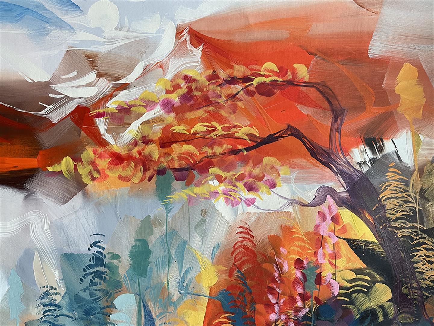 Bright and beautiful original acrylic on canvas. Hand signed by artist. This artwork comes rolled. Approximately 80x48 inches