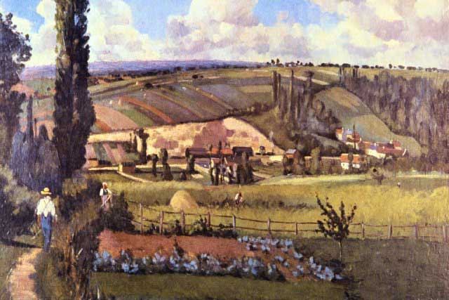 Artist : Camille Pissarro - Title: Landscape with Farm Houses - Medium: Fine Art Reproduction Giclee on Canvas - Image Size: Approximately 13.25 inches x 20 inches - Unframed on Unstretched Canvas - Biography: Camille Pissarro was a Danish-French Impressionist and Neo-Impressionist painter born on the island of St Thomas. His importance resides in his contributions to both Impressionism and Post-Impressionism. Pissarro studied from great forerunners, including Gustave Courbet and Jean-Baptiste-Camille Corot.