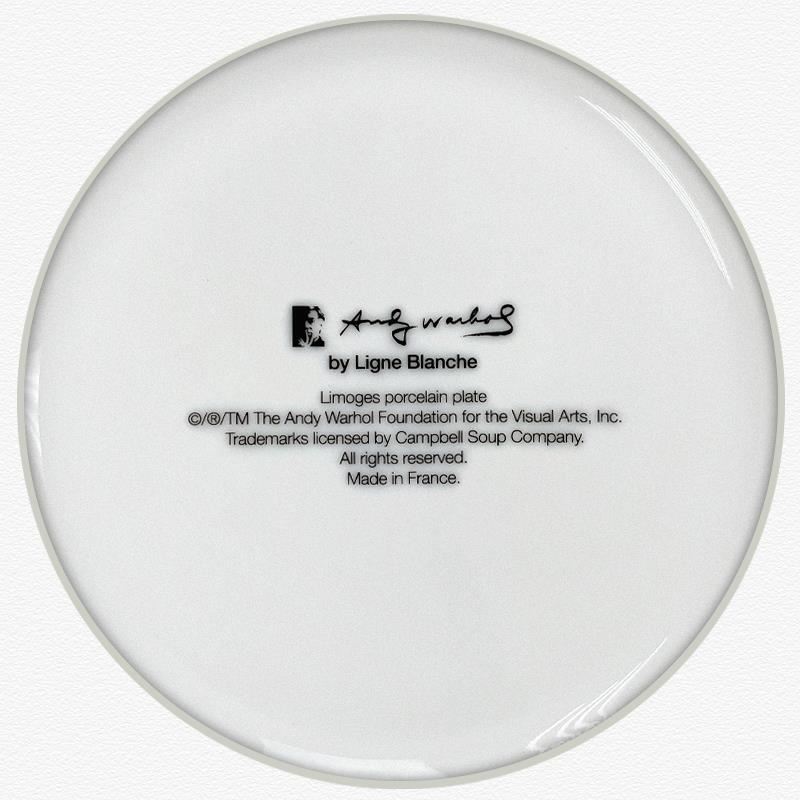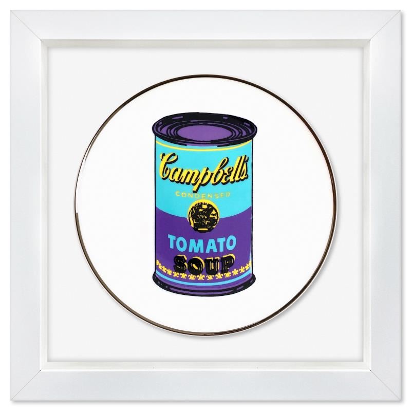 "Campbell (Turquoise/Purple)" is a Limoges porcelain plate bearing the plate signature inverso of Andy Warhol (1928-1987). This plate is custom framed and floated on linen. Measures approx. 13.5" x 13.5" (frame), 8.5" (plate diameter).