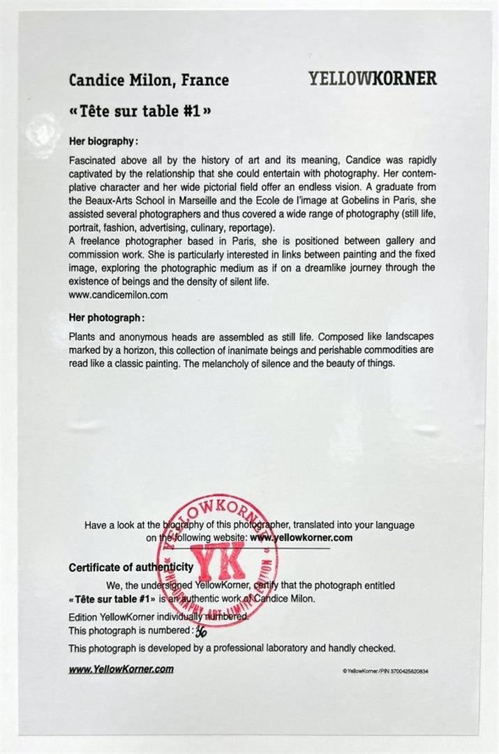 Candice Milon France Tete Sur Table #1 Still Life YellowKorner Certified Photograph. Certificate of Authenticity from YellowKorner affixed to the back. Matted Dimensions 16"x20". Protected with Clear Mylar Sleeve.