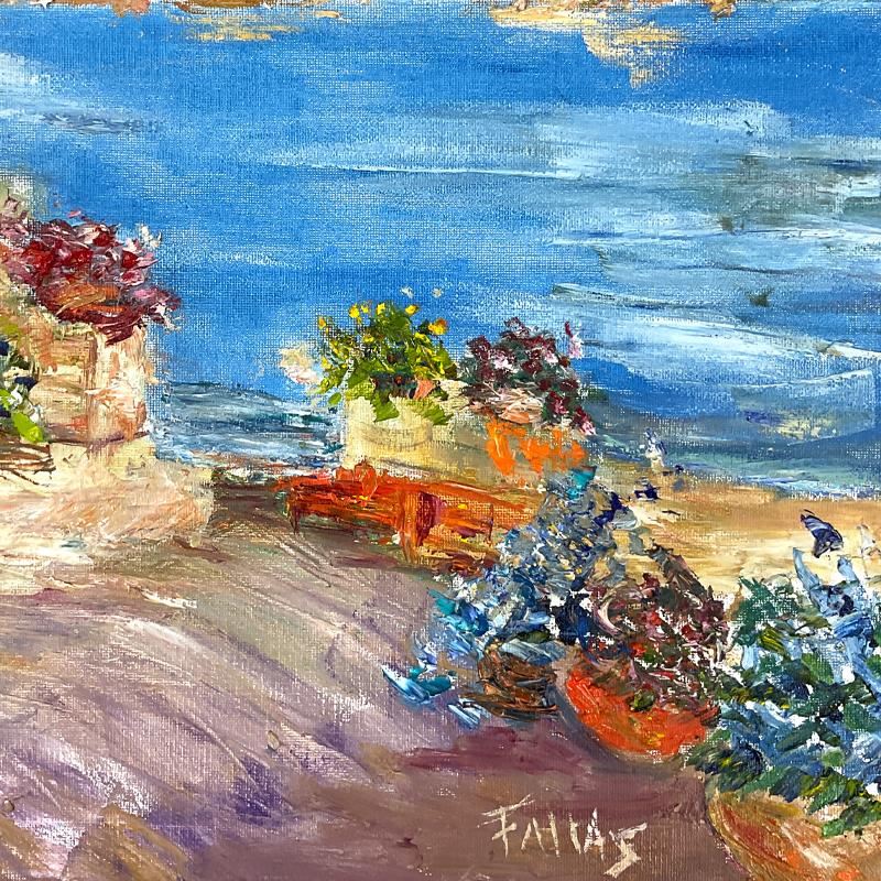 "Capri Vista" is an original oil painting on stretched canvas by Elliot Fallas, hand signed by the artist. Includes Letter of Authenticity. Measures approx. 20" x 16" (image). The sides of the canvas are painted and it can be hung as is, but a frame is definitely recommended.