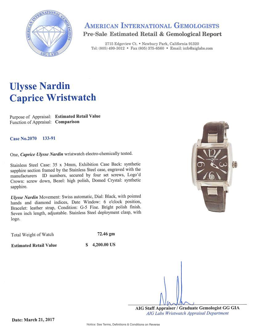 One, Caprice Ulysse Nardin wristwatch electro-chemically tested.Stainless Steel Case: 35 x 34mm, Exhibition Case Back: synthetic sapphire section framed by the Stainless Steel case, engraved with the manufacturers ID numbers, secured by four set screws, Logo'd Crown: screw down, Bezel: high polish, Domed Crystal: synthetic sapphire.Ulysse Nardin Movement: Swiss automatic, Dial: Black, with pointed hands and diamond indices, Date Window: 6 o'clock position, Bracelet: leather strap, Condition: G-5 Fine. Bright polish finish. Seven inch length, adjustable. Stainless Steel deployment clasp, with logo. Total Weight of Watch 72.46gm. AIG Appraised at $4,200.00.