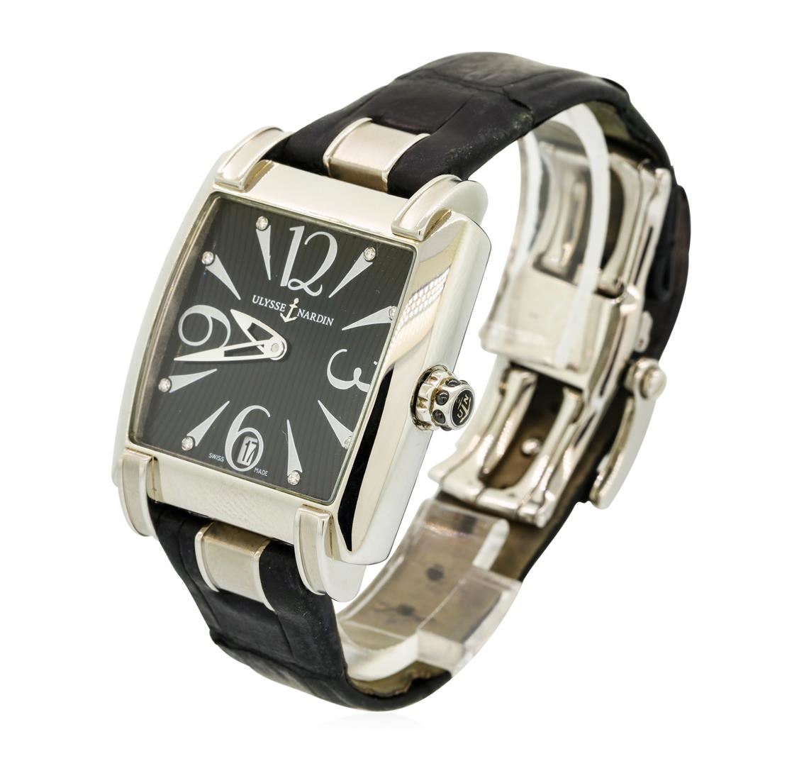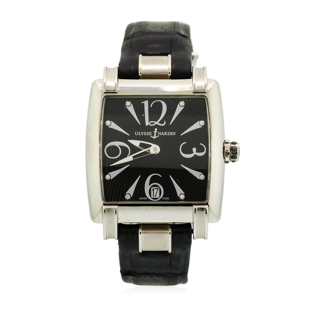 One, Caprice Ulysse Nardin wristwatch electro-chemically tested.Stainless Steel Case: 35 x 34mm, Exhibition Case Back: synthetic sapphire section framed by the Stainless Steel case, engraved with the manufacturers ID numbers, secured by four set screws, Logo'd Crown: screw down, Bezel: high polish, Domed Crystal: synthetic sapphire.Ulysse Nardin Movement: Swiss automatic, Dial: Black, with pointed hands and diamond indices, Date Window: 6 o'clock position, Bracelet: leather strap, Condition: G-5 Fine. Bright polish finish. Seven inch length, adjustable. Stainless Steel deployment clasp, with logo. Total Weight of Watch 72.46gm. AIG Appraised at $4,200.00.