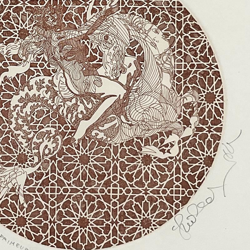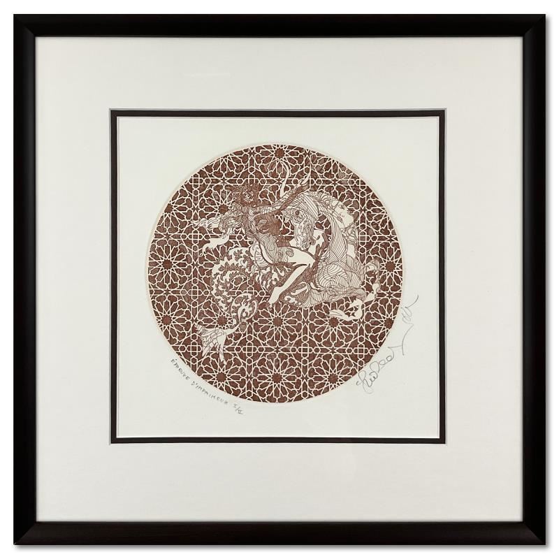 "Capricorn" is a limited edition etching on paper by Guillaume Azoulay, numbered I/II and hand signed by the artist. This piece comes custom framed. Includes Letter of Authenticity. Measures approx. 18" x 18" (frame), 9" (image-diameter).