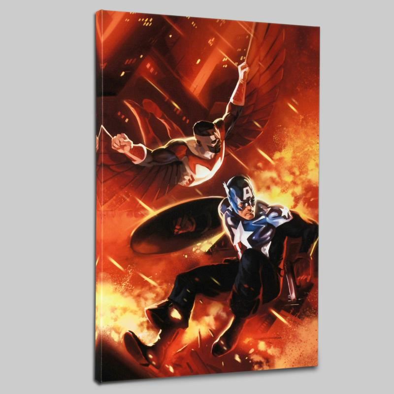 A piece of comic book history, this limited edition, from original art by Mitchell Breitweiser, depicts an iconic image of Captain America with The Falcon. Since 2005, Mitchell Breitweiser has been penciling, inking, and painting his way through dozens of Marvel comic books and covers. Mitch has left a lasting impression with his Captain America books, including 2010's Captain America: Patriot Mini Series. "Captain America #607" is a limited edition giclee on canvas by Mitchell Breitweiser presented by Marvel Comics. This piece comes gallery wrapped and ready to hang. Includes Certificate of Authenticity! Measures approx. 18" x 27" (image).