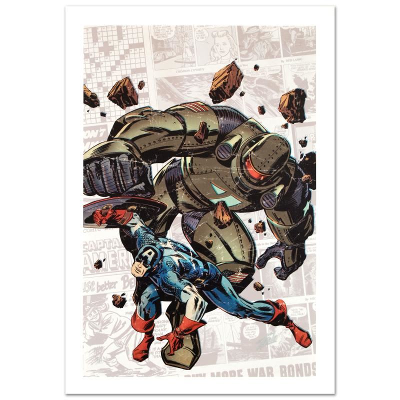 A piece of comic book history, this limited edition, from original art by Butch Guice, depicts the classic Captain America. Working in the comic industry since the 1980s, Jackson "Butch" Guice is known for his Marvel work on the X-Men and Captain America franchises. "Captain America: The 1940s Newspaper Strip #2" is a limited edition giclee on canvas by Butch Guice presented by Marvel Comics, numbered and hand signed by the great Stan Lee! Includes Certificate of Authenticity! Measures approx. 18" x 27" (image).