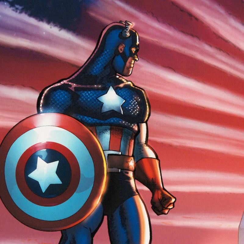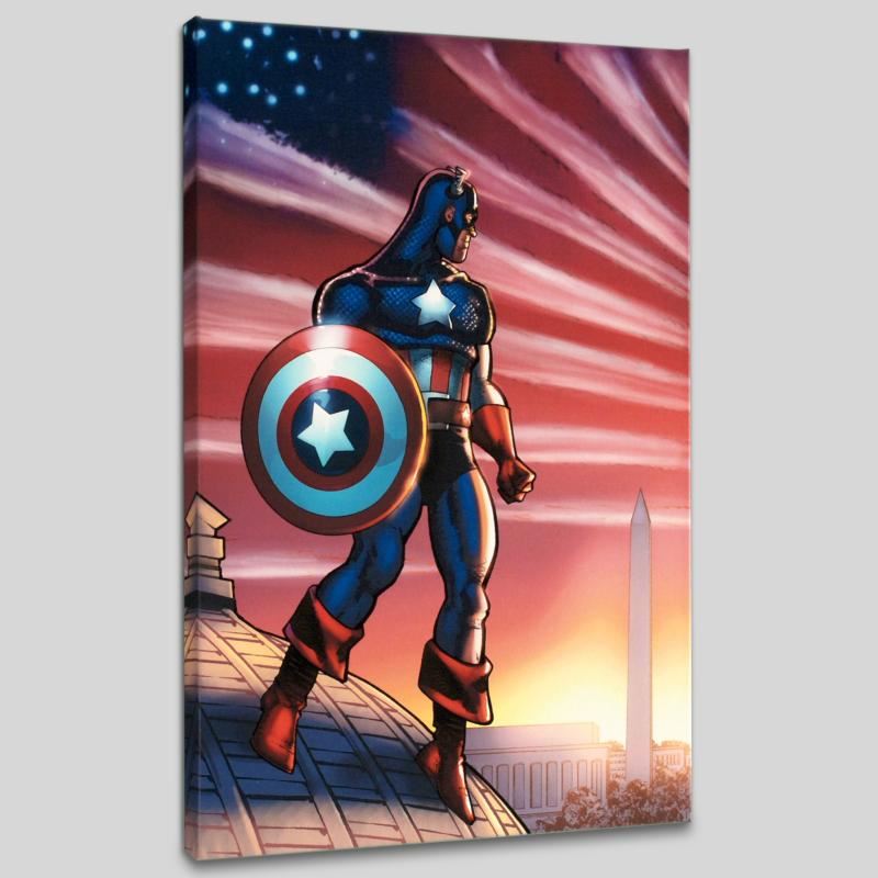 A piece of comic book history, this limited edition, from original art by Howard Chaykin, depicts a heroic Captain America standing in front of an idealistic landscape of American Patriotism. Howard Victor Chaykin is an American comic book writer and artist famous for his innovative storytelling and sometimes controversial material. Chaykin's main influences are the mid-20th Century book illustrators Robert Fawcett, Al Parker, and others. "Captain America Theatre of War: America First! #1" is a limited edition numbered giclee on stretched canvas by Howard Chaykin presented by Marvel Comics. This piece comes gallery wrapped. Includes Certificate of Authenticity! Measures approx. 18" x 27" (image); 1.5" (depth).