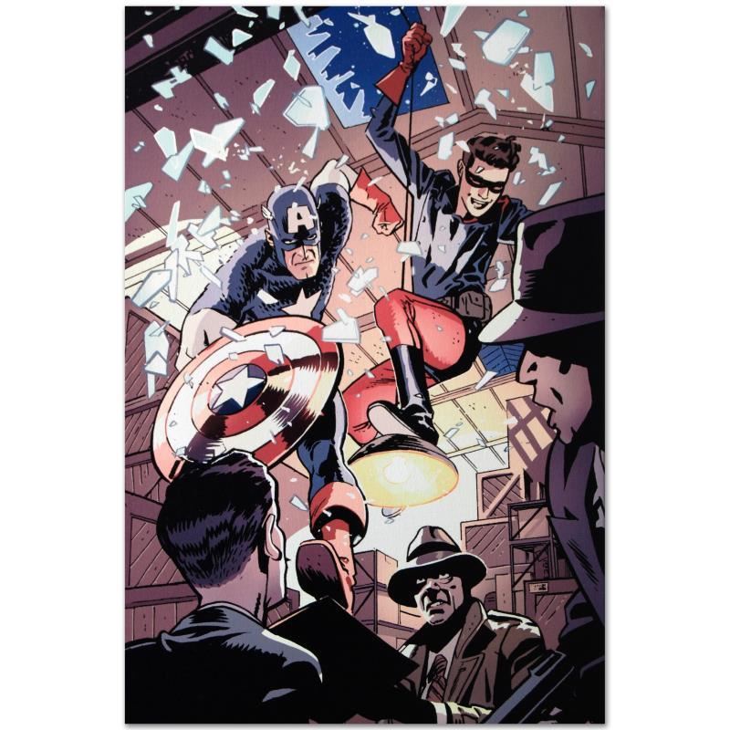 A piece of comic book history, this limited edition, from original art by Chris Samnee, depicts classic characters from the Captain America franchise. Having previously done work on the Thor franchise, Chris Samnee is currently working on Captain America & Bucky with Ed Brubaker and Marc Andreyko. "Captain America and Bucky #621" is a limited edition numbered giclee on stretched canvas by Chris Samnee presented by Marvel Comics. This piece comes gallery wrapped. Includes Certificate of Authenticity! Measure approx. 18" x 27" (image); 1.5" (depth). This item requires special handling and may have a longer than usual turnaround.