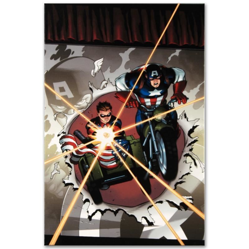 A piece of comic book history this limited edition from original art by Ed McGuinness features the duo of Captain America and his long time friend Bucky. In May 2006 McGuinness entered an exclusive two-year contract with Marvel Comics. His first printed Marvel piece was a cover for the Marvel limited series Civil War. He is best known for his work on the "Red Hulk" series. "Captain America and Bucky #621" is a limited edition numbered giclee on stretched canvas by Ed McGuinness presented by Marvel Comics. This piece comes gallery wrapped. Includes Certificate of Authenticity! Measure approx. 18" x 27" (image); 1.5" (depth). This item requires special handling and may have a longer than usual turnaround.