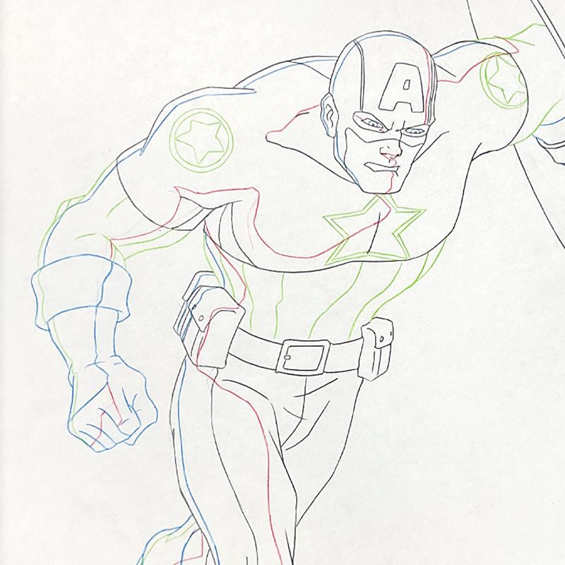"Captain America" is an original production drawing on animation paper by Marvel Comics. Includes Letter of Authenticity. Measures approx. 14" x 10" (image).