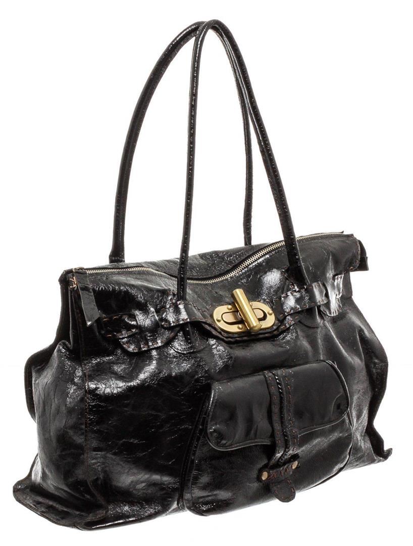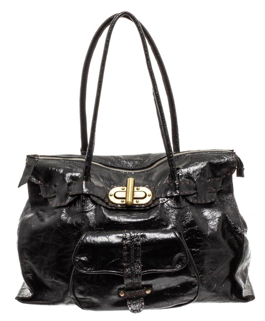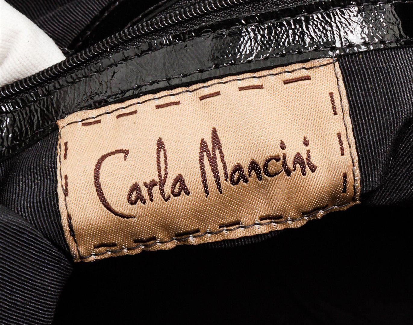 Carla Mancini black crinkle patent leather tote bag with black nylon lining, interior zip pocket, front exterior flap pocket, zip top closure. Measurements: Length: 16.5 in / 42 cm Width: 5.5 in / 14 cm 11 in / 28 cm Condition: Pre-Owned Good overall, please see photographs for detail.