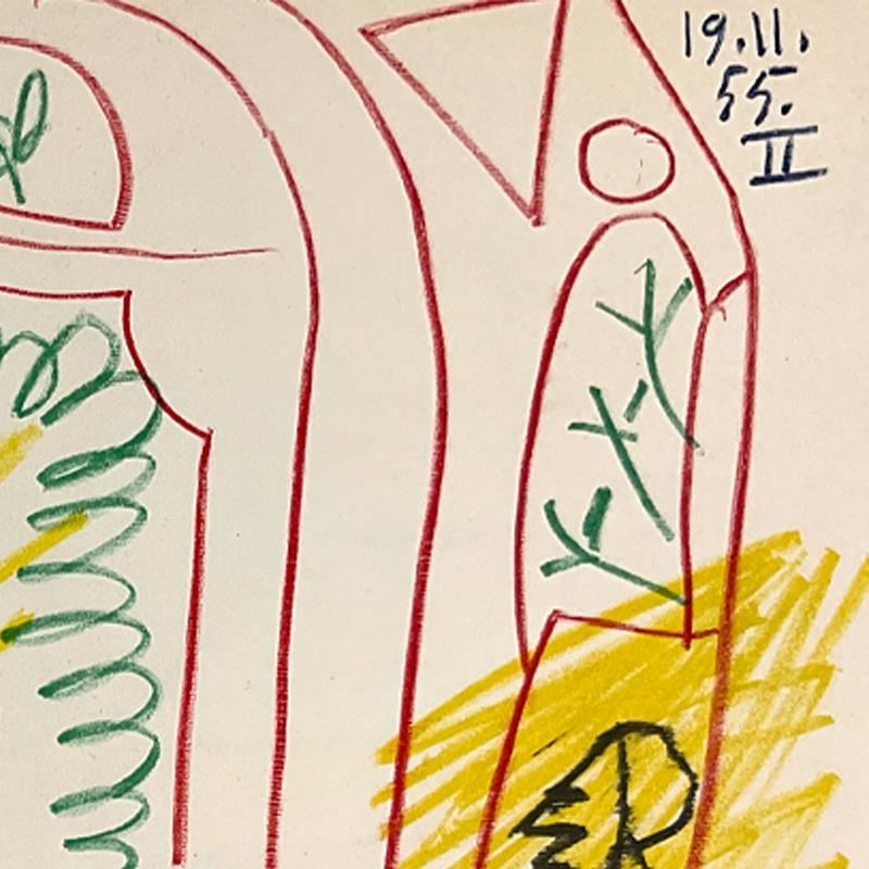 "Carnet de Californie 19.11.55-II" is a vintage lithograph on paper by Pablo Picasso (1881-1973). This piece is from Picassos Carnet de Californie Series and was printed in Paris France by Mourlot Studios in 1959. This piece comes framed. Includes Letter of Authenticity. Measures approx. 18.5" x 24.5" (frame) 10.5" x 16.5" (image).