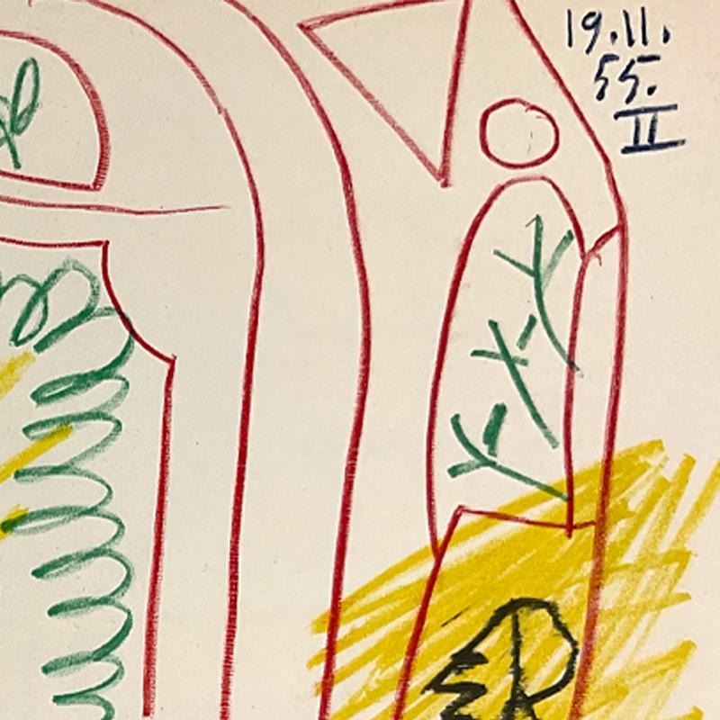 "Carnet de Californie 19.11.55-II" is a vintage lithograph on paper by Pablo Picasso (1881-1973). This piece is from Picasso's Carnet de Californie Series and was printed in Paris, France by Mourlot Studios in 1959. This piece comes framed. Includes Letter of Authenticity. Measures approx. 18.5" x 24.5" (frame), 10.5" x 16.5" (image). This item requires special handling and may have a longer than usual turnaround.