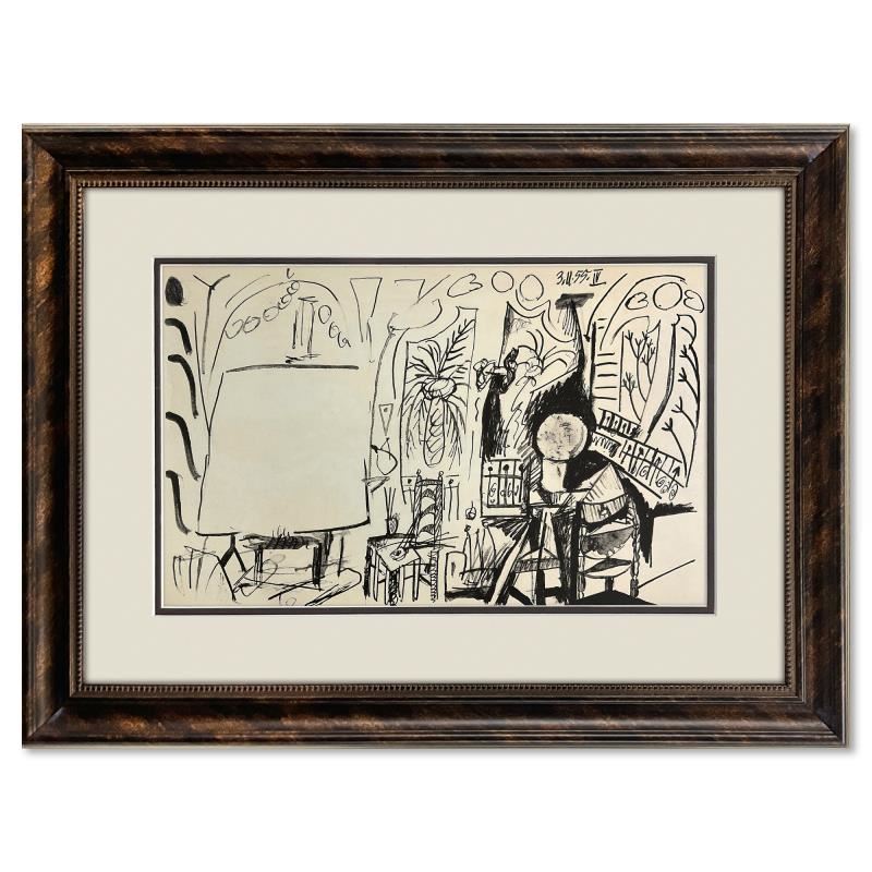 "Carnet de Californie 3.11.55-IV" is a vintage lithograph on paper by Pablo Picasso (1881-1973). This piece is from Picasso's Carnet de Californie Series and was printed in Paris, France by Mourlot Studios in 1959. This piece comes framed. Includes Letter of Authenticity. Measures approx. 18.5" x 24.5" (frame), 10.5" x 16.5" (image).