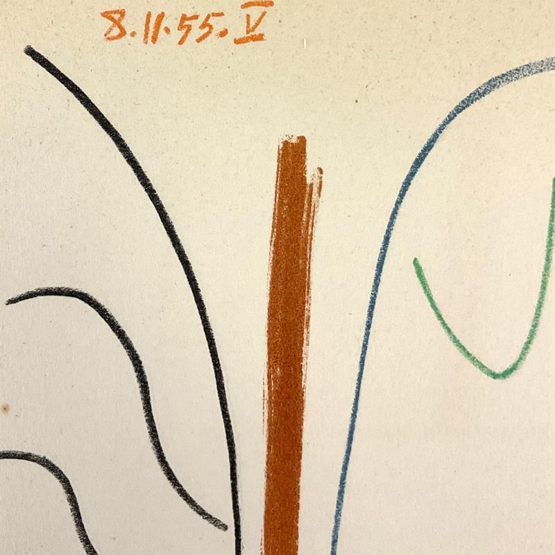 "Carnet de Californie 8.11.55-V" is a vintage lithograph on paper by Pablo Picasso (1881-1973). This piece is from Picasso's Carnet de Californie Series and was printed in Paris, France by Mourlot Studios in 1959. This piece comes framed. Includes Letter of Authenticity. Measures approx. 18.5" x 24.5" (frame), 10.5" x 16.5" (image). This item requires special handling and may have a longer than usual turnaround.