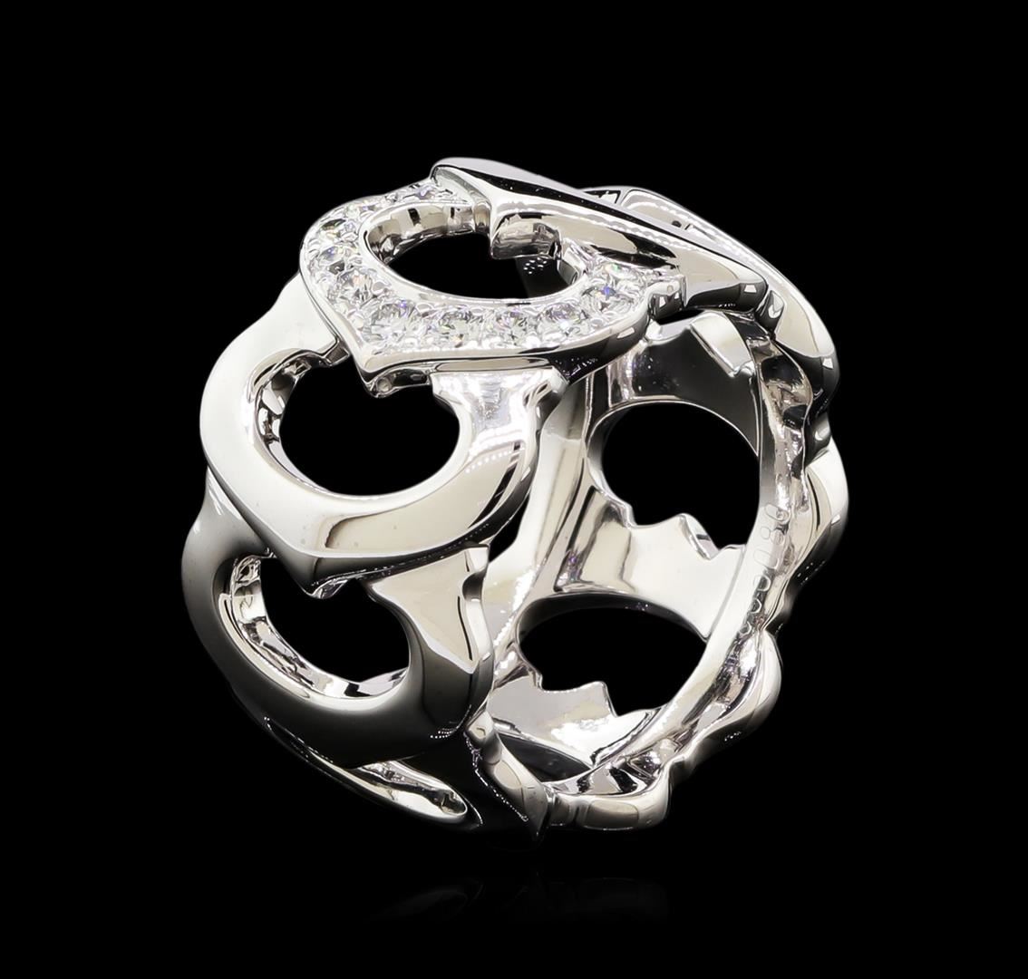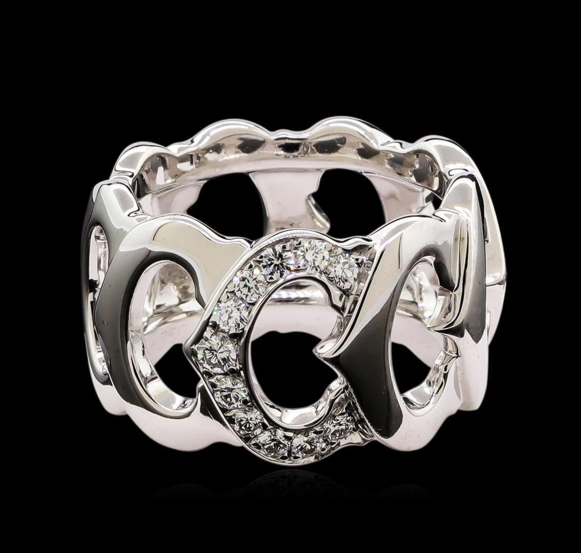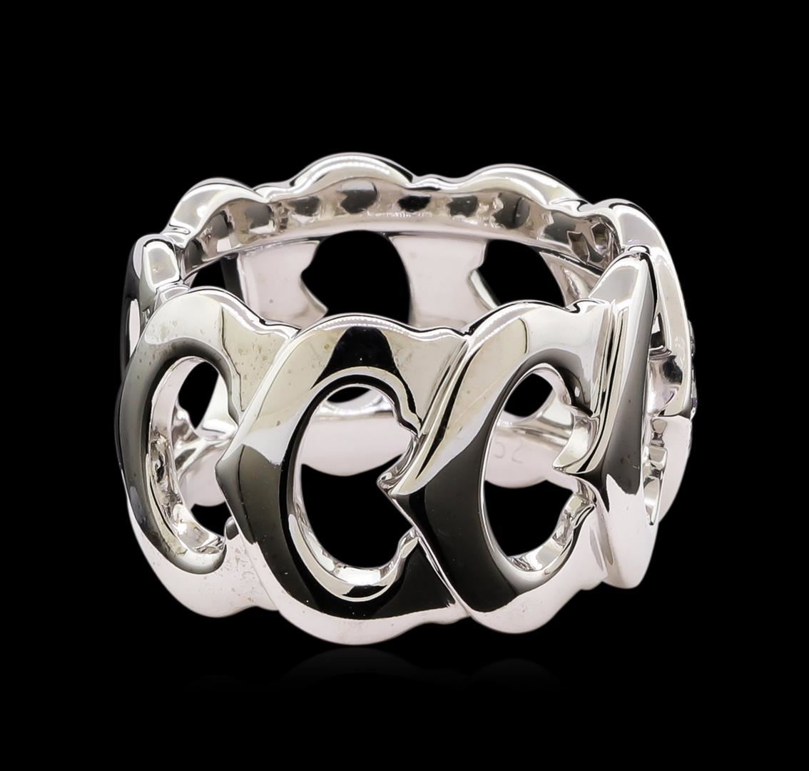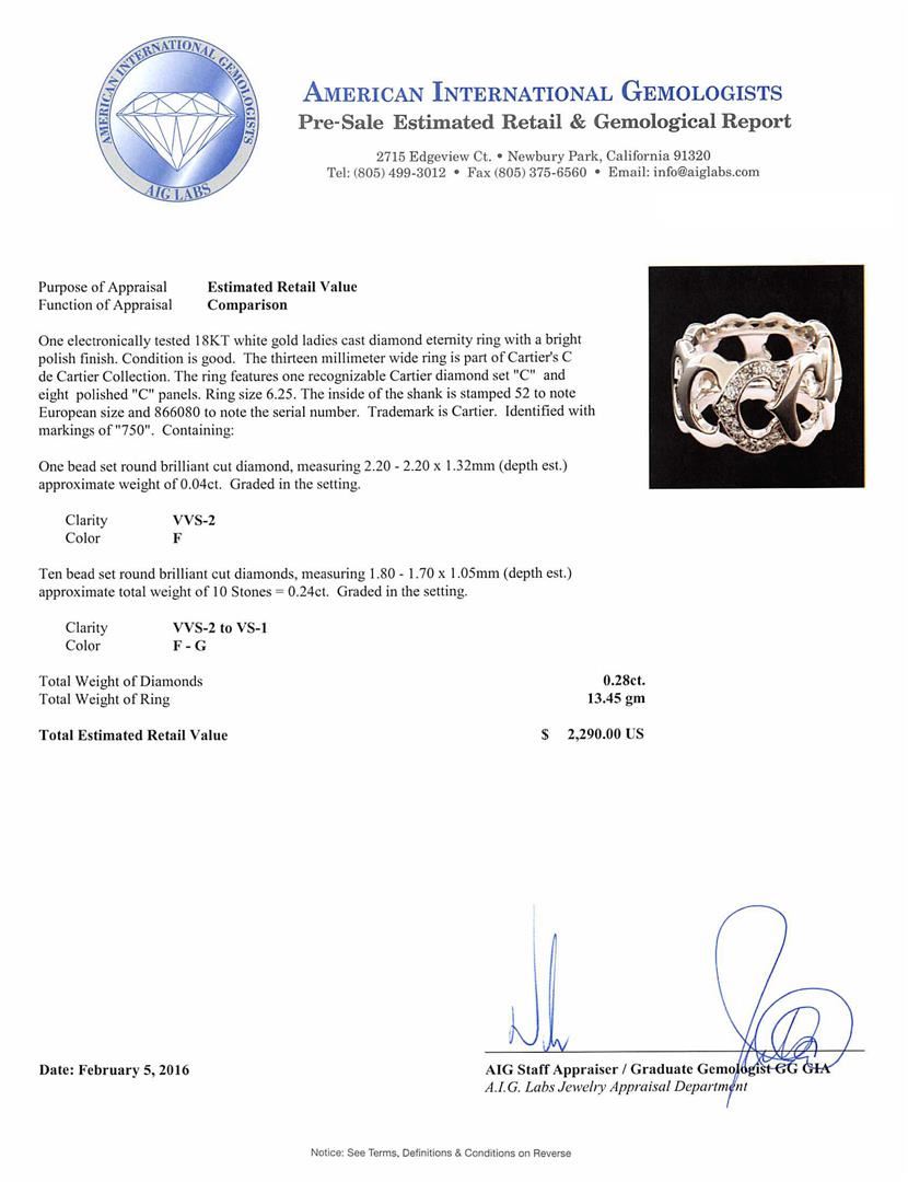 One electronically tested 18KT white gold ladies cast diamond eternity ring with a bright polish finish. The thirteen millimeter wide ring is part of Cartier's C de Cartier Collection. The ring features one recognizable Cartier diamond set "C" and eight polished "C" panels. Ring size 6.25. The inside of the shank is stamped 52 to note European size and 866080 to note the serial number. Trademark is Cartier. Identified with markings of "750". Condition is good. Containing: One bead set round brilliant cut diamond, measuring 2.20 - 2.20 x 1.32mm (depth est.) approximate weight of 0.04ct. Graded in the setting. Clarity: VVS-2. Color: F Ten bead set round brilliant cut diamonds, measuring 1.80 - 1.70 x 1.05mm (depth est.) approximate total weight of 10 Stones = 0.24ct. Graded in the setting. Clarity: VVS-2 to VS-1. Color: F - G. Total Weight of Diamonds 0.28ct. Total Weight of Ring 13.45gm. AIG Appraised at $2,290.00.