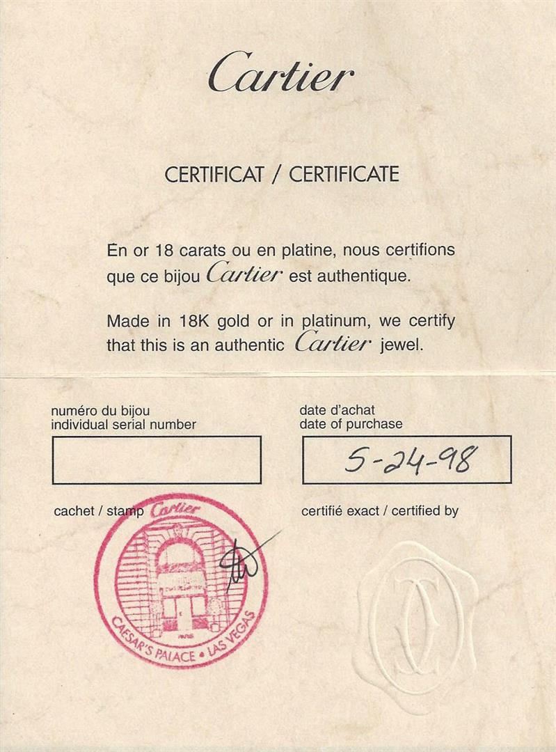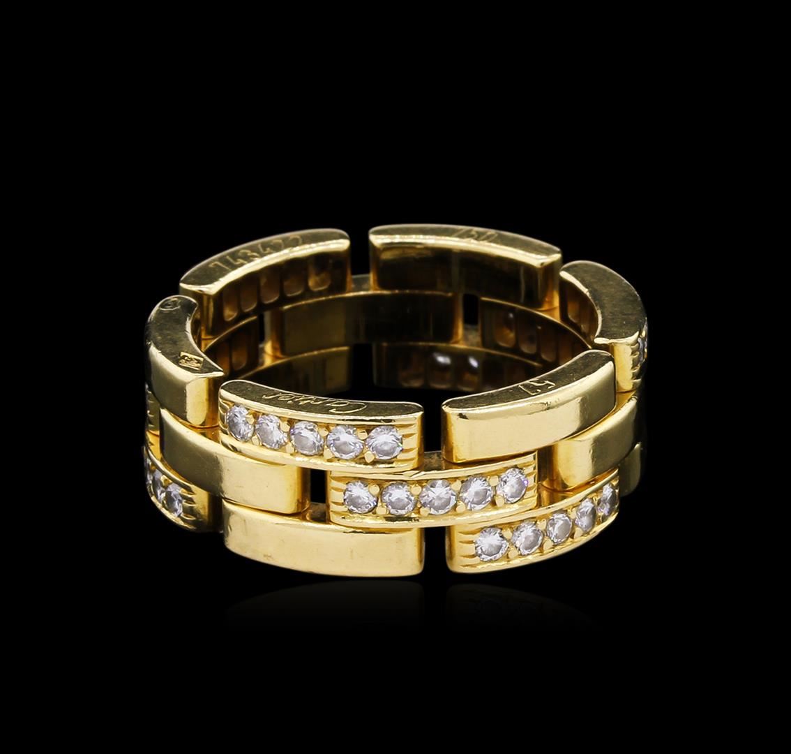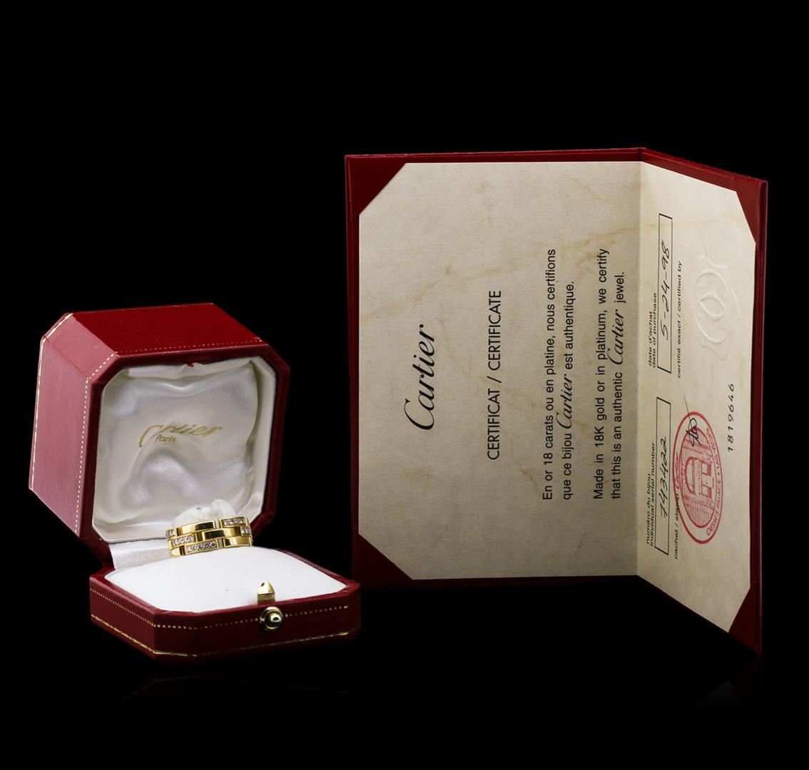 Ring is from an older collection. This ring has alternating rows of diamonds; The collection is named after the Panthere jewels, Cartier's icon. The creature inspires the precious and supple movements of the chain that adorns the neck or wrist with sensuality; 45 diamonds with a total weight of 0.90ct. Ring is 12.4 grams total weight; Size 8; Stamped: 750. Comes with original Cartier certificate of purchase; Ring was originally purchased is 1998. Excellent condition & absolutely beautiful!