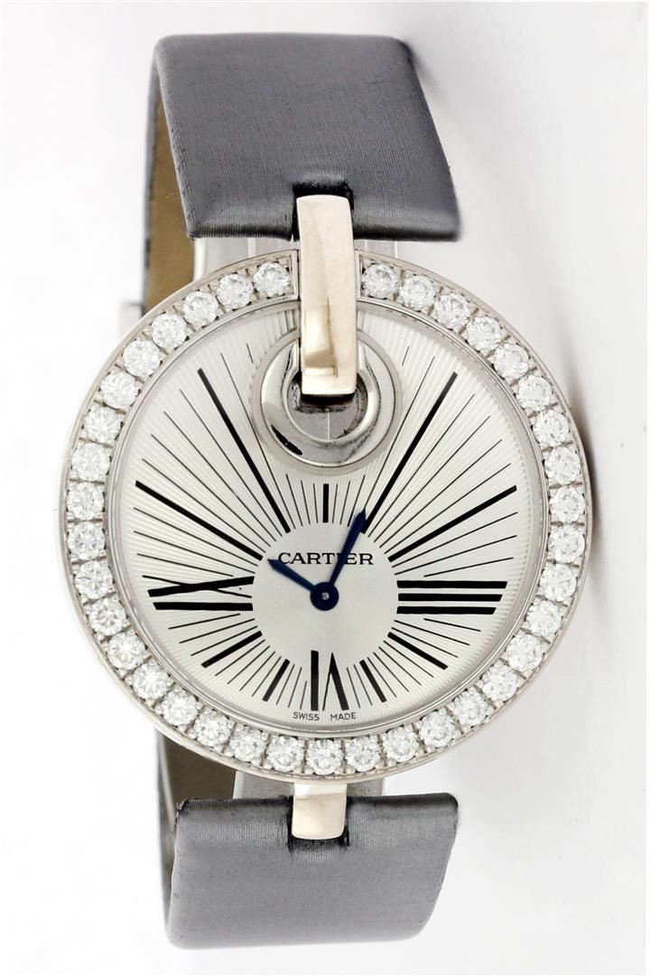 One Ladies White Gold Captive De Cartier, Serviced & Electronically Tested, Case:35mm, 18K White Gold, Bezel: White Gold Beadset Diamond Bezel, Diamond Count: 40 Diamonds, Diamond Weight: 1.89 Carats, Crystal: Sapphire Lens. Movement: Quartz Movement. Silver Guilloche Dial With Sunburst Finish. Model#3120 Condition: G-6 Extra Fine. Band: Tiole Brosee Fabric Strap 6.0 Inch Length, Adjustable. White Gold Deployment Buckle.