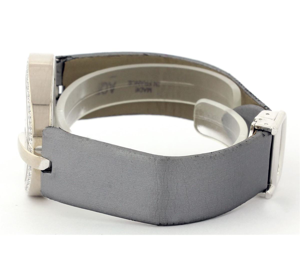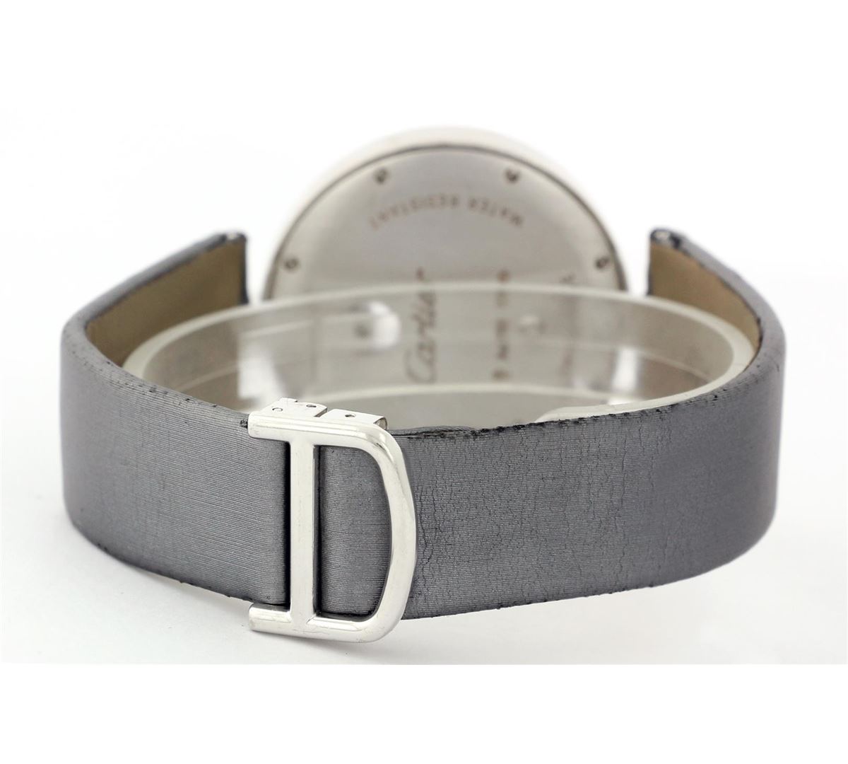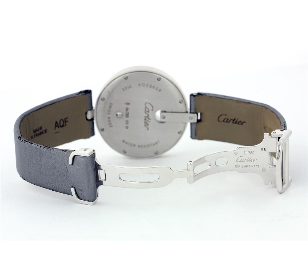 One Ladies White Gold Captive De Cartier, Serviced & Electronically Tested, Case:35mm, 18K White Gold, Bezel: White Gold Beadset Diamond Bezel, Diamond Count: 40 Diamonds, Diamond Weight: 1.89 Carats, Crystal: Sapphire Lens. Movement: Quartz Movement. Silver Guilloche Dial With Sunburst Finish. Model#3120 Condition: G-6 Extra Fine. Band: Tiole Brosee Fabric Strap 6.0 Inch Length, Adjustable. White Gold Deployment Buckle.
