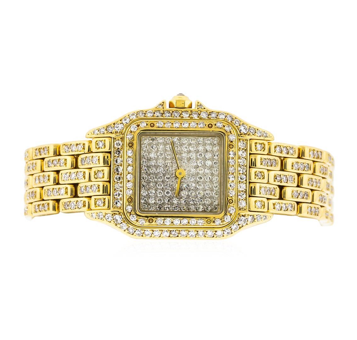One ladies, Cartier Panthere wristwatch electronically tested 18KT yellow gold, Case: 30 x 22mm, Case Back: secured by eight set screws, engraved with the Swiss Hallmark, the manufacturers name, and information, Cartier Signature Crown: octagonal, set with an inverted round brilliant diamond, Customized Bezel: diamond set, Crystal: synthetic sapphire. Movement: quartz, Custom Dial: set throughout with diamonds, Customized Cartier Panthere Bracelet: 18KT yellow gold, set throughout with diamonds, Condition: G-5 Fine. Bright polish finish. Five and one half inch length. Swiss Hallmarked Cartier concealed deployment clasp. Containing: Approximately Three hundred ninety-seven prong set single cut diamonds, measuring 1.40 - 1.00mm, estimated total weight 397 Stones = 2.50ct. Clarity: VVS-1 to VS-1 Average Color F - H. Total Weight of Diamonds 2.50ct. Total Weight of Watch 59.17gm. AIG Appraised at $29,050.00.